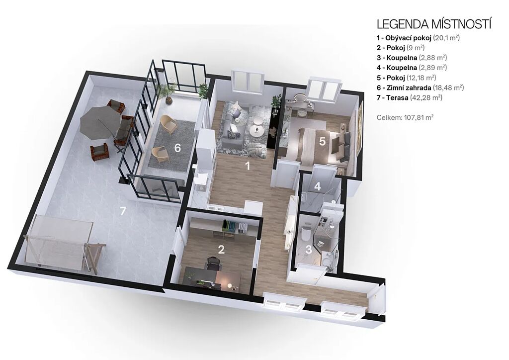 Prodej bytu ve 2. patře, 3+kk o velikosti 63,5 m² + terasa a zimní zahrada 59 m², celkem tedy 122,5 m², ve slavném projektu Barrandov Hills na ulici Geologická, Praha 5 – Hlubočepy.