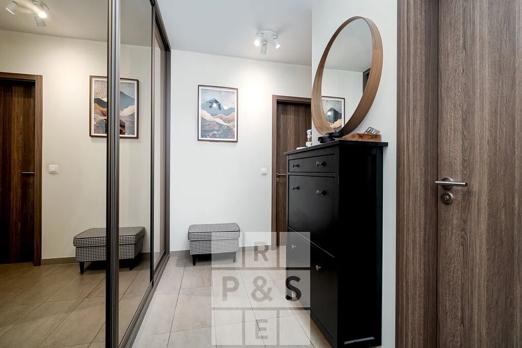 Byt je ve výborném stavu, vybavený klimatizací a kvalitními moderními materiály. Dominantou bytu je prostorný balkon, který se táhne podél obou pokojů a nabízí krásný výhled do okolí – ideální místo pro relaxaci nebo posezení s přáteli. Díky orientaci bytu je interiér světlý a působí velmi příjemně a vzdušně.