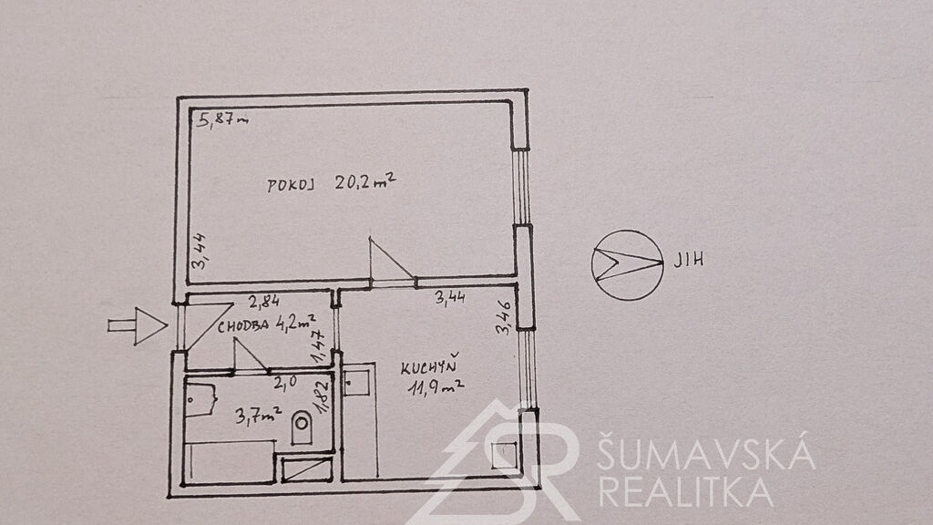 Dispozice bytu zahrnuje vstupní chodbu (4,2 m²), koupelnu se sprchovým koutem a WC (3,7 m²), prostornou kuchyň (11,9 m²) s plně vybavenou kuchyňskou linkou a světlý obývací pokoj (20,2 m²) vybavený dvoulůžkem a sedací soupravou. Byt je slunný s výhledem směrem k řece Řezné.