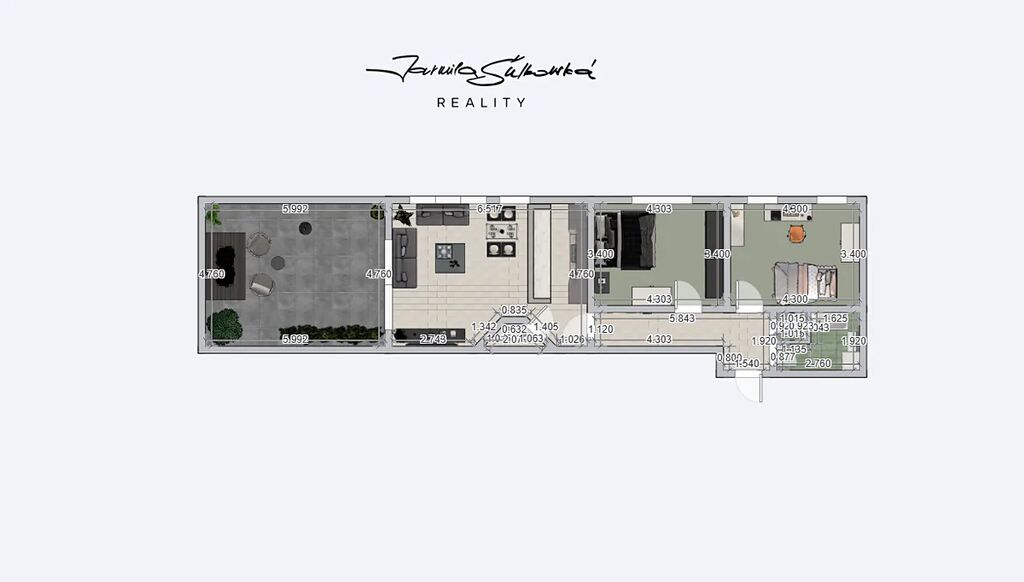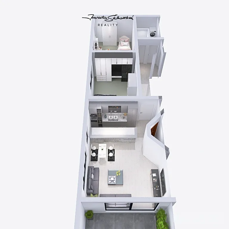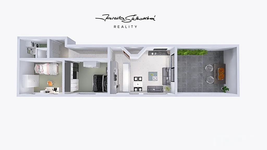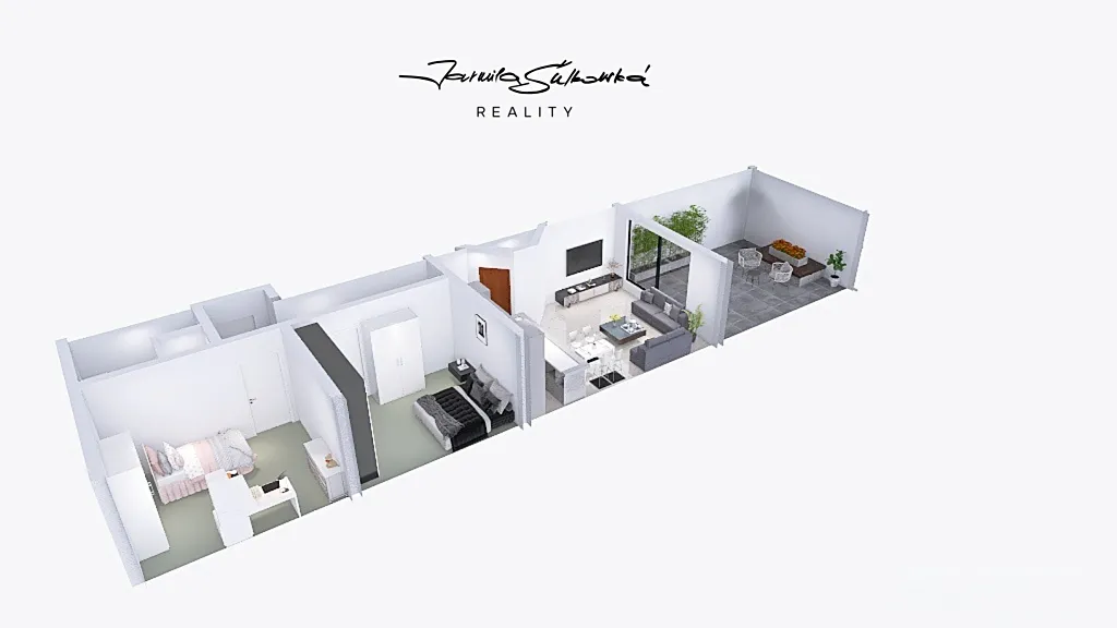 Byt zaujme svou promyšlenou dispozicí, neprůchozími pokoji a napojením interiéru na venkovní prostor. Dominantou je západně orientovaná terasa, která nabízí naprosté soukromí a klid – ideální pro ranní kávu, odpočinek po práci či večerní posezení s přáteli.