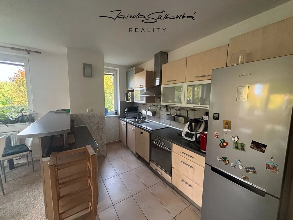 Kuchyňská linka je plně vybavená: myčka, sklokeramická deska, trouba, digestoř, mikrovlnná trouba a lednice.