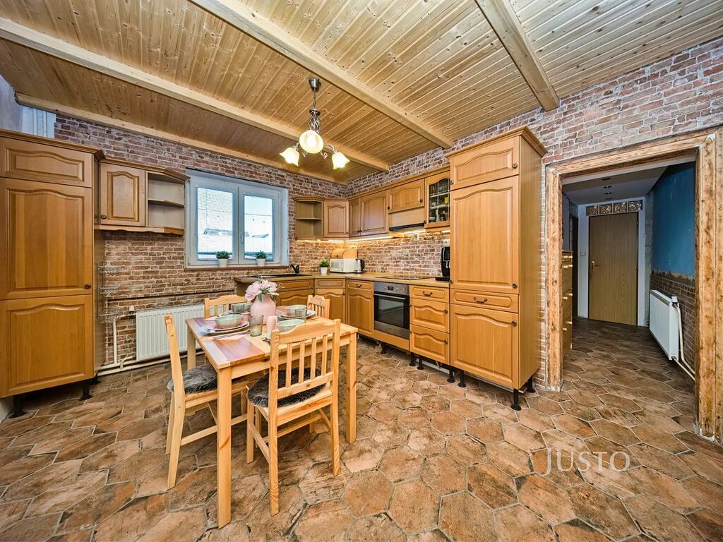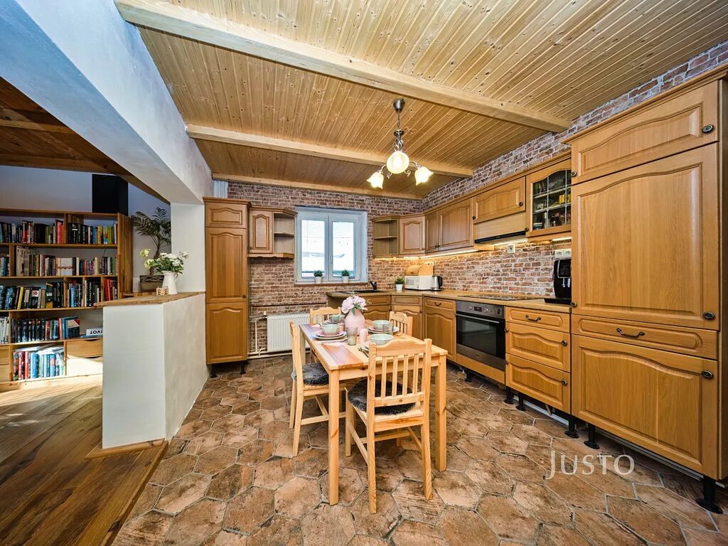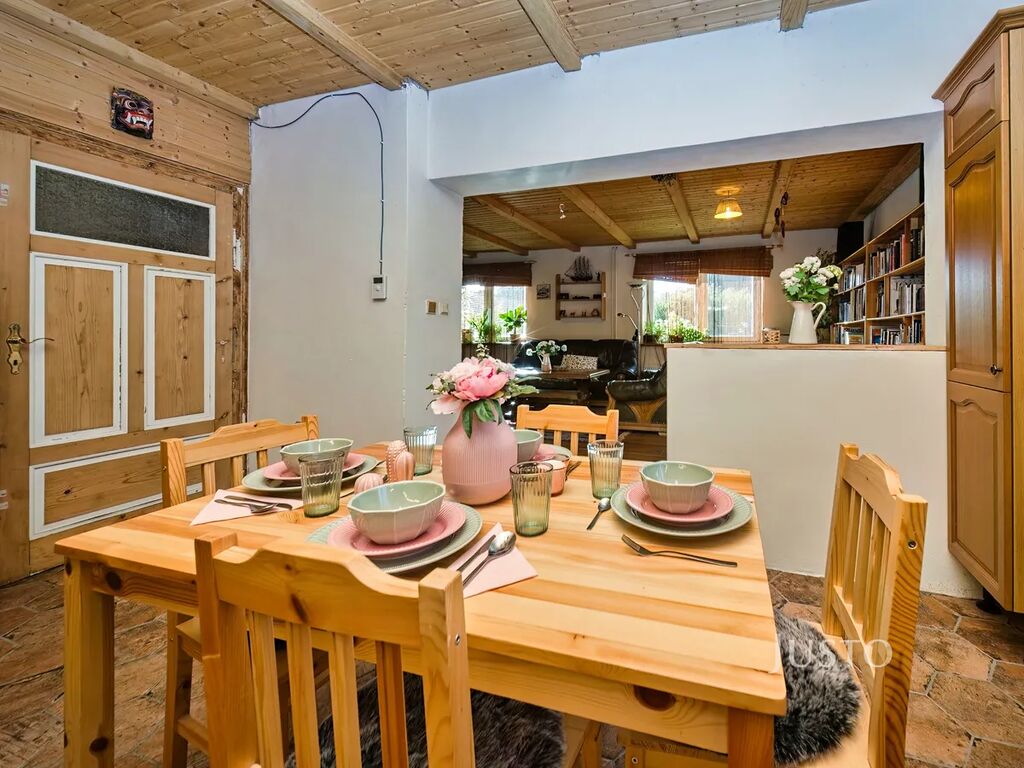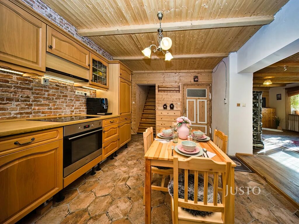 V zastoupení majitele nabízíme k prodeji rodinný dům ve stylu roubenky o dispozici 4+kk. V domě je ve velké míře použito dřevo, aby dům působil útulným dojmem. V přízemí domu se nachází předsíň, na kterou navazuje kuchyně propojená s obývacím pokojem. V obývacím pokoji jsou velká kachlová kamna, která navozují příjemnou a pohodovou atmosféru domu( majitelé si kamna sice odvezou, ale nový majitel si může vyřešit vytápění podle svých přestav.) Podlaha je z ošetřených borovicových prken a strop je obložen dřevem. Obývací pokoj přímo navazuje na kuchyni a tvoří jeden velký otevřený prostor, kdy může být celá rodina neustále v kontaktu.