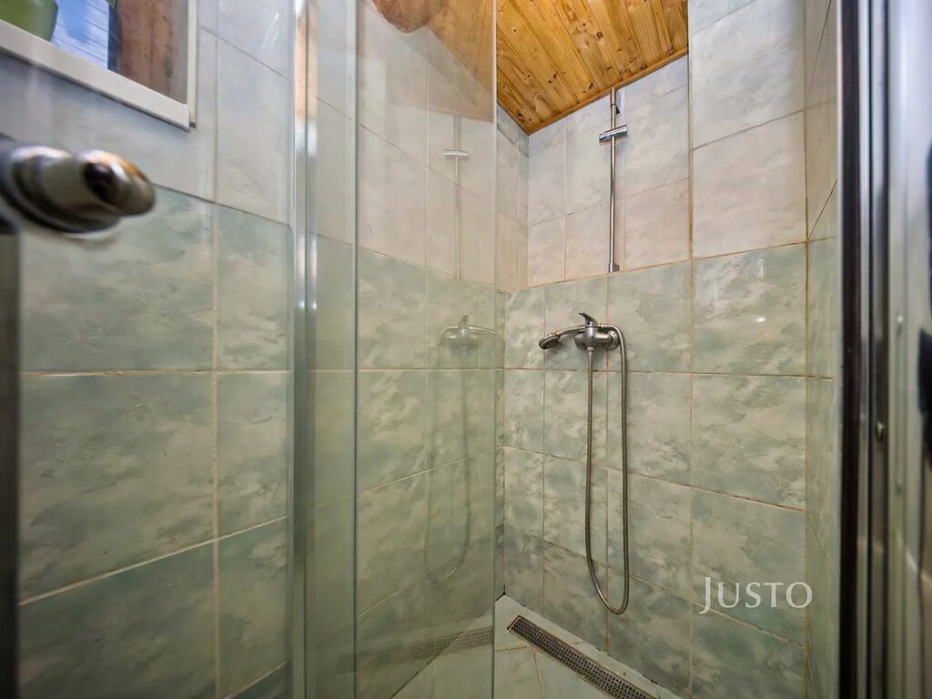 V přízemí domu je také koupelna, kde je vana i sprchový kout a umyvadlo. Toaleta je v přízemí řešena samostatně. Za koupelnou jsou i úložné prostory pro skladování potravin.