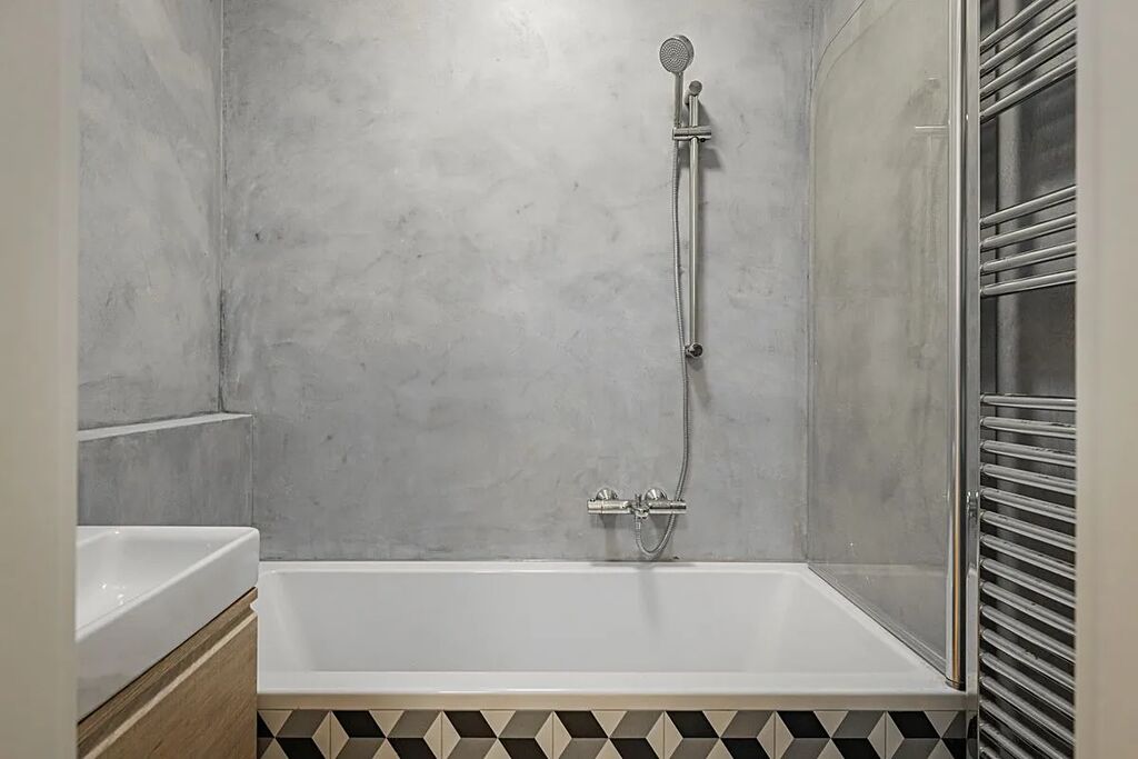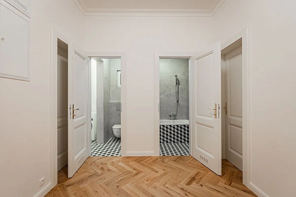 Byt má krásné dřevěné parkety v perfektním stavu a moderní designové prvky včetně vestavěných skříní.