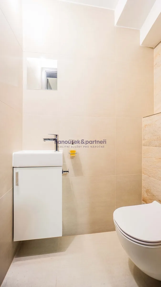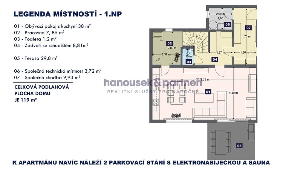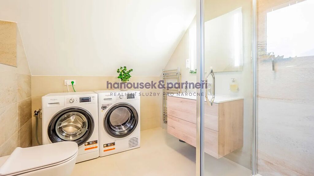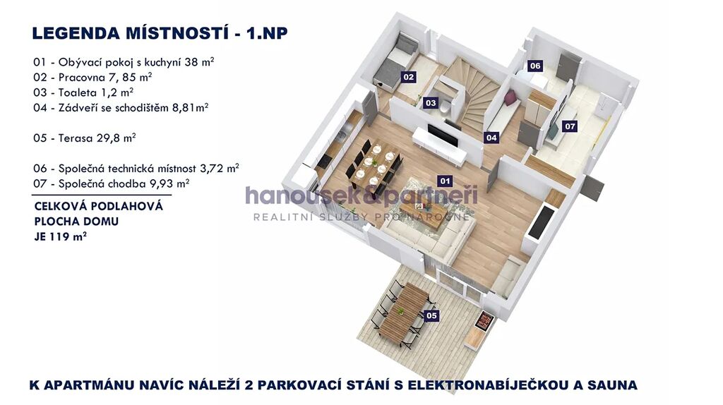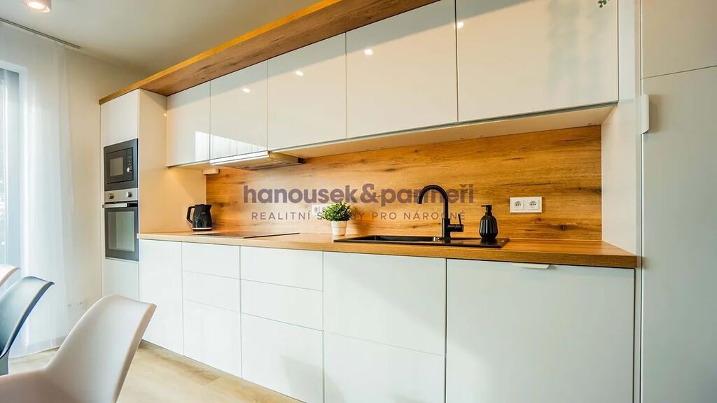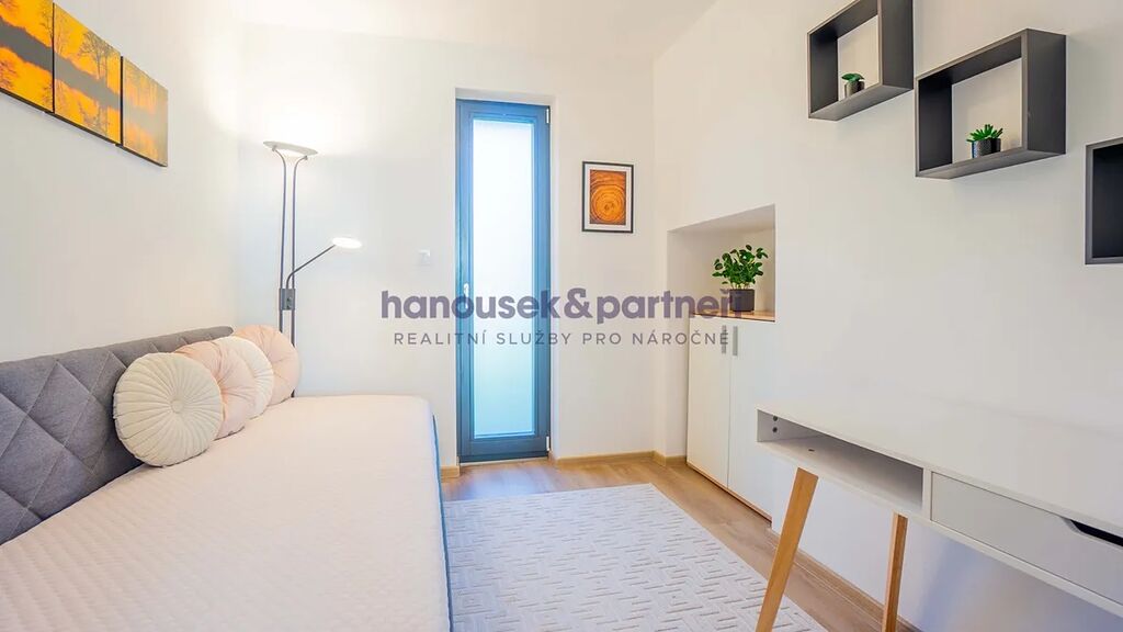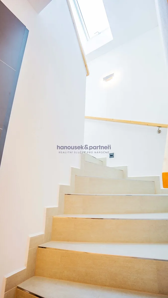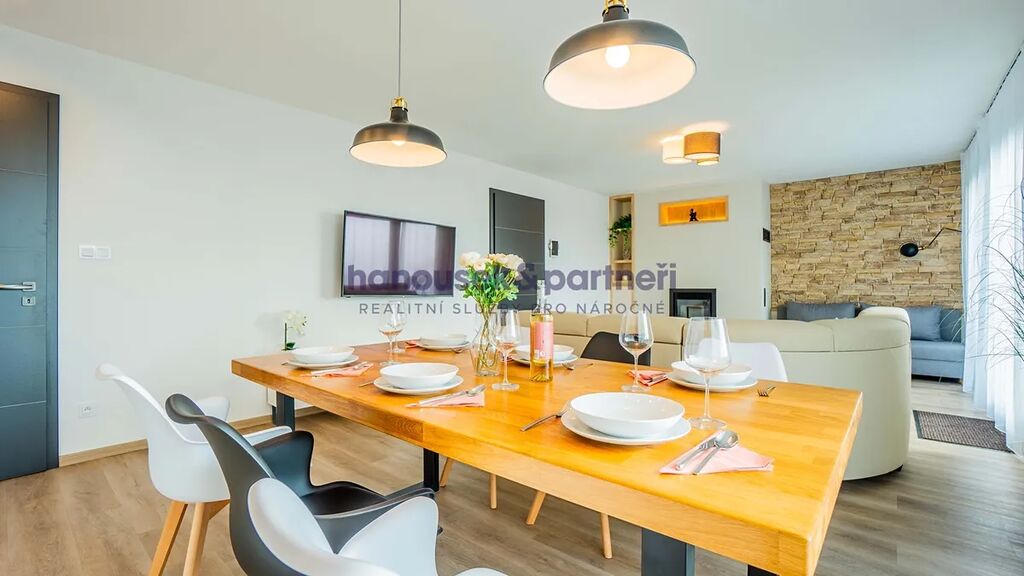 Apartmán je jedním ze dvou bytů v cihlové rodinné novostavbě. Má dispozici 3+kk a celkovou výměru 119 m2. V přízemí je obývací pokoj s kuchyní a  vstupem na terasu, pracovna a samostatné WC. V patře jsou dvě ložnice a dvě koupelny.