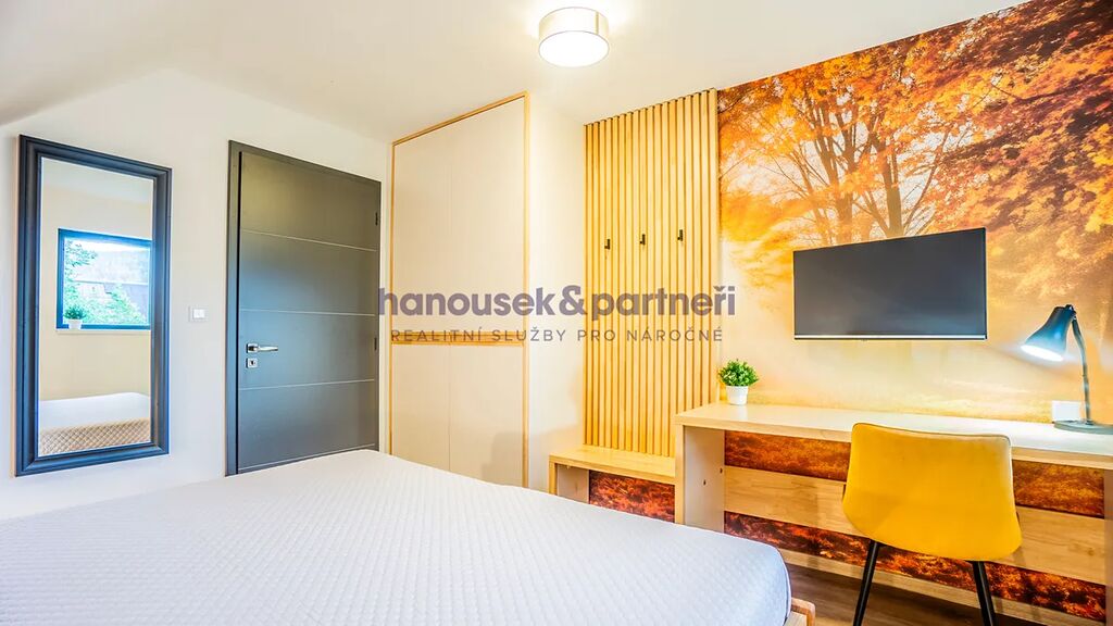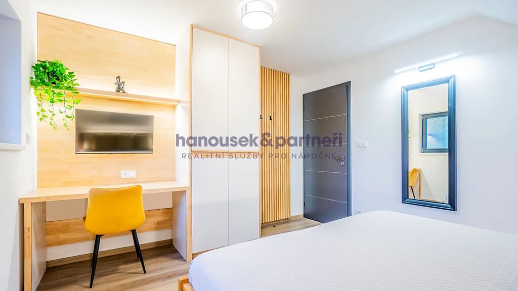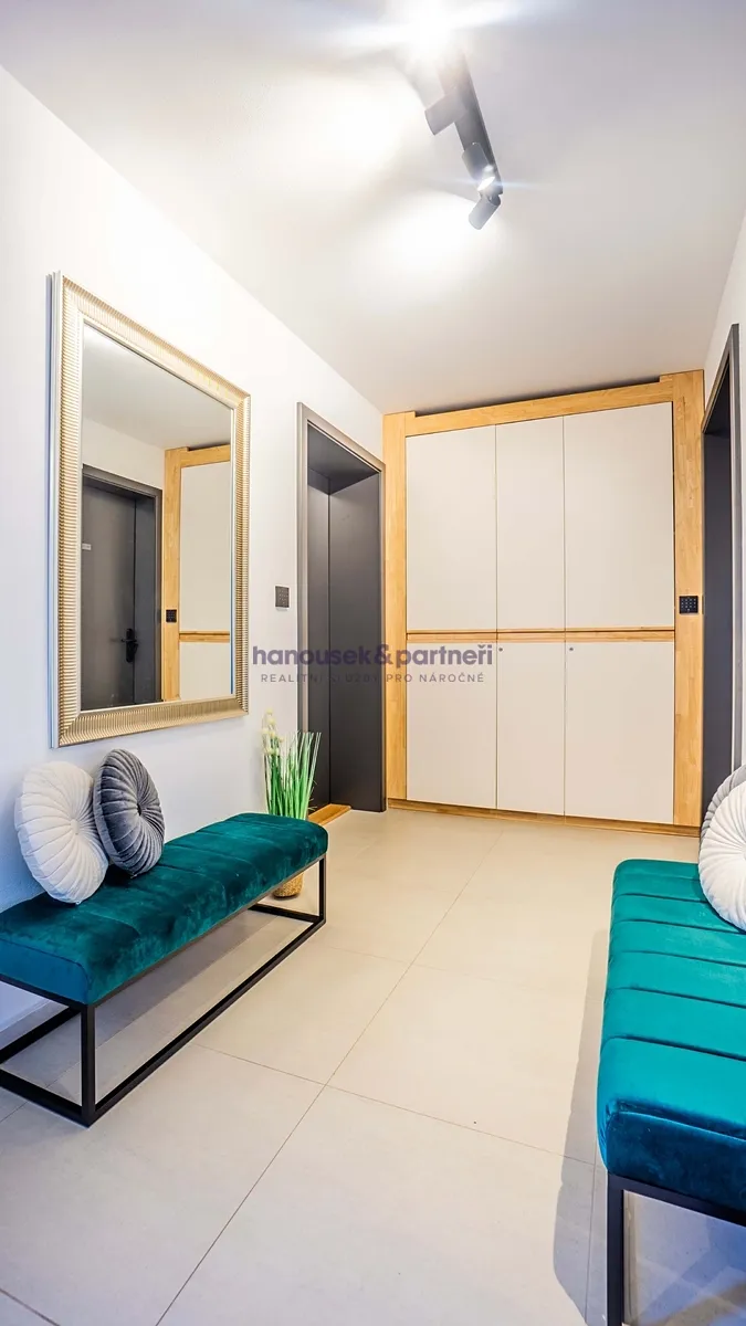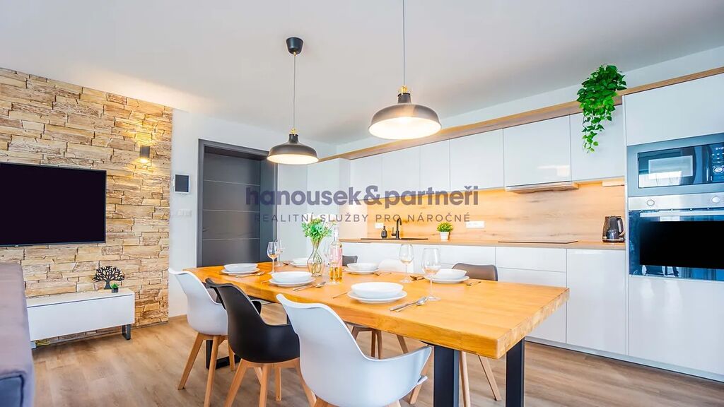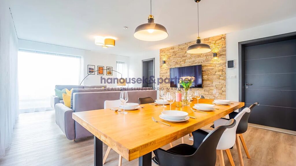Apartmán je jedním ze dvou bytů v cihlové rodinné novostavbě. Má dispozici 4+kk a celkovou výměru 111 m2. V přízemí je obývací pokoj s kuchyní a  vstupem na terasu, koupelna a samostatné WC. V patře jsou tři ložnice a koupelna.