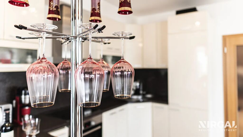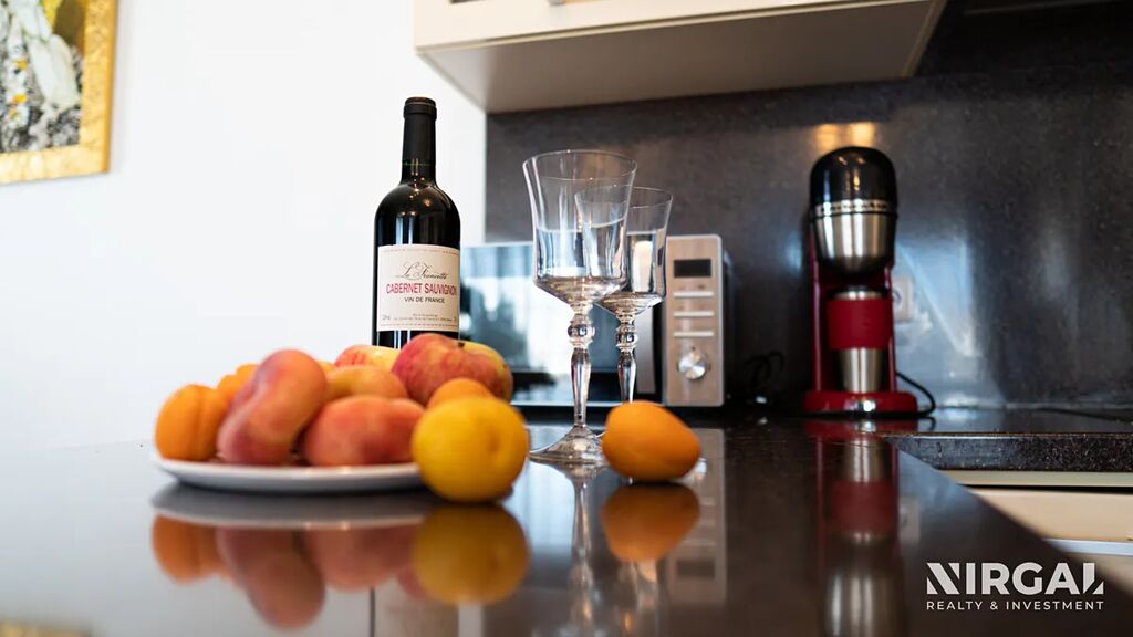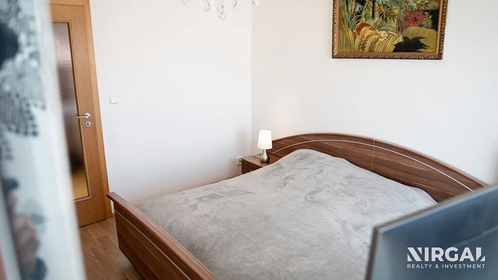 Dispozice bytu je velmi praktická – všechny místnosti jsou neprůchozí, což zajišťuje dostatek soukromí a komfortu pro celou rodinu. K dispozici je ložnice, dětský pokoj s francouzským balkonem a prostorný obývací pokoj s jídelní částí a plně vybavenou moderní kuchyní. Z obývacího pokoje je vstup na velký balkon s nádherným výhledem do okolí. Velká rohová francouzská okna zaručují dostatek denního světla a příjemný pocit vzdušnosti po celý den.