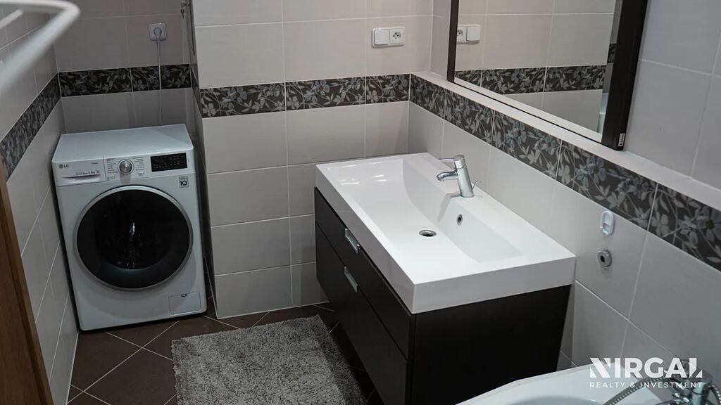 Byt má samostatnou toaletu s umyvadlem, prostornou koupelnu s rohovou vanou a podlahovým topením, a velkou komoru/šatnu v předsíni. K vybavení patří také elektrické venkovní žaluzie a bezpečnostní systém včetně bezpečnostních dveří.