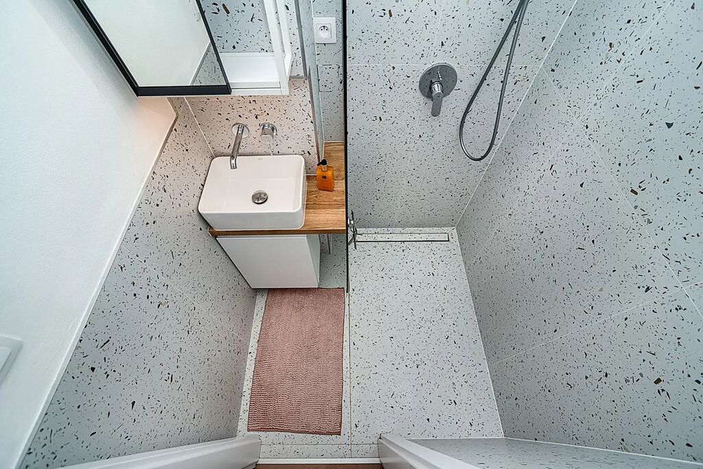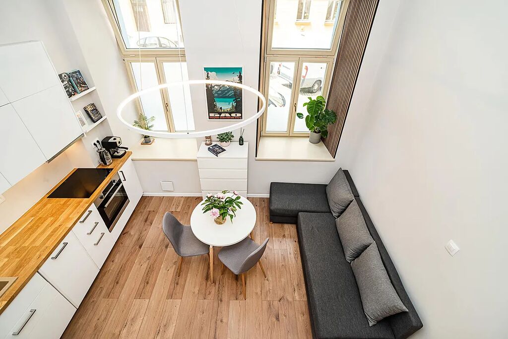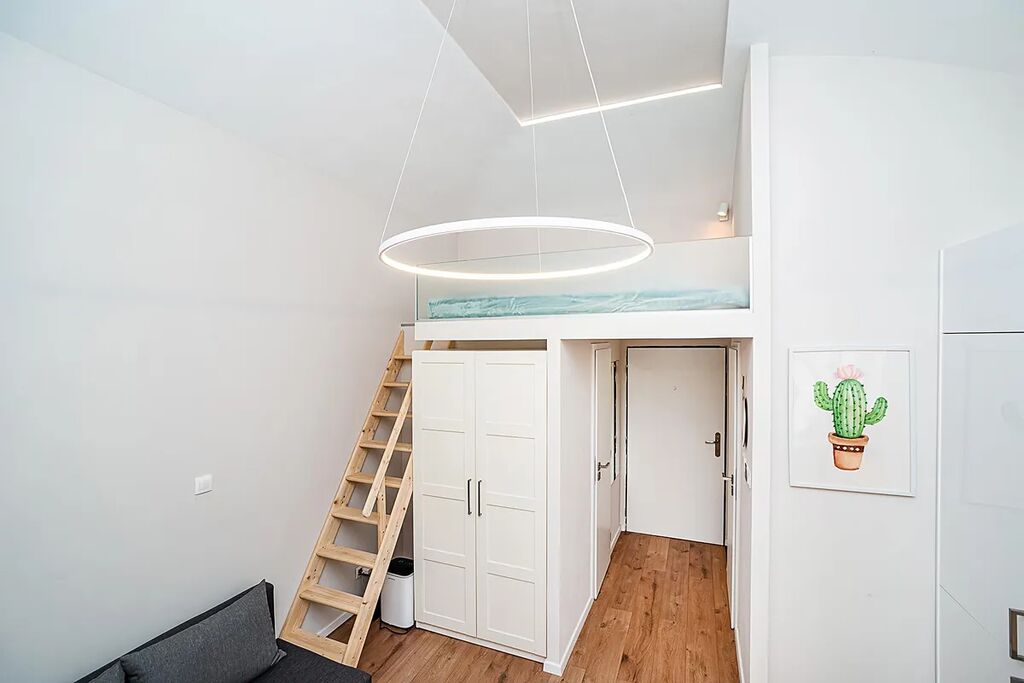 Dispozice bytu nabízí světlý obývací pokoj s kuchyňským koutem, koupelnu se sprchovým koutem a toaletou a praktické řešení se spacím patrem. K bytu náleží také praktický sklep na patře o velikosti 5 m², kde je umístěna pračka.