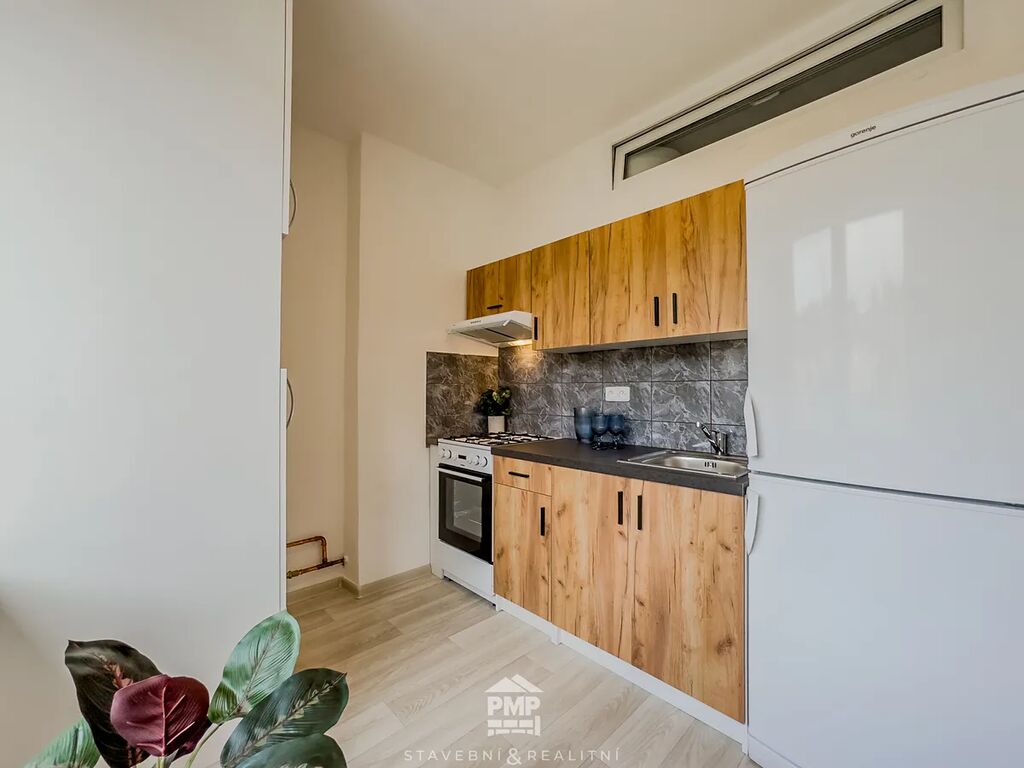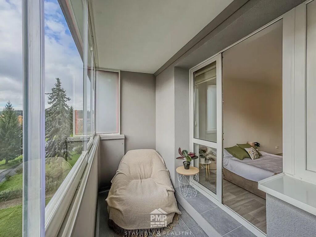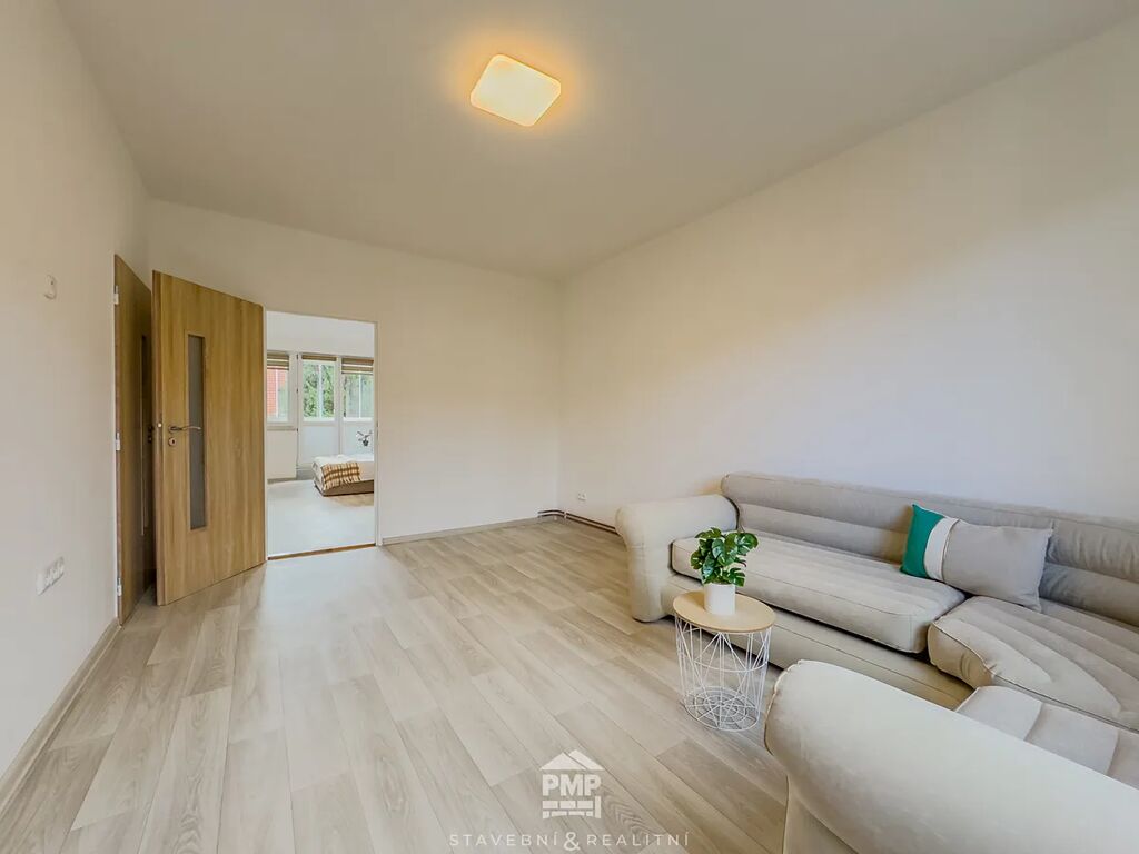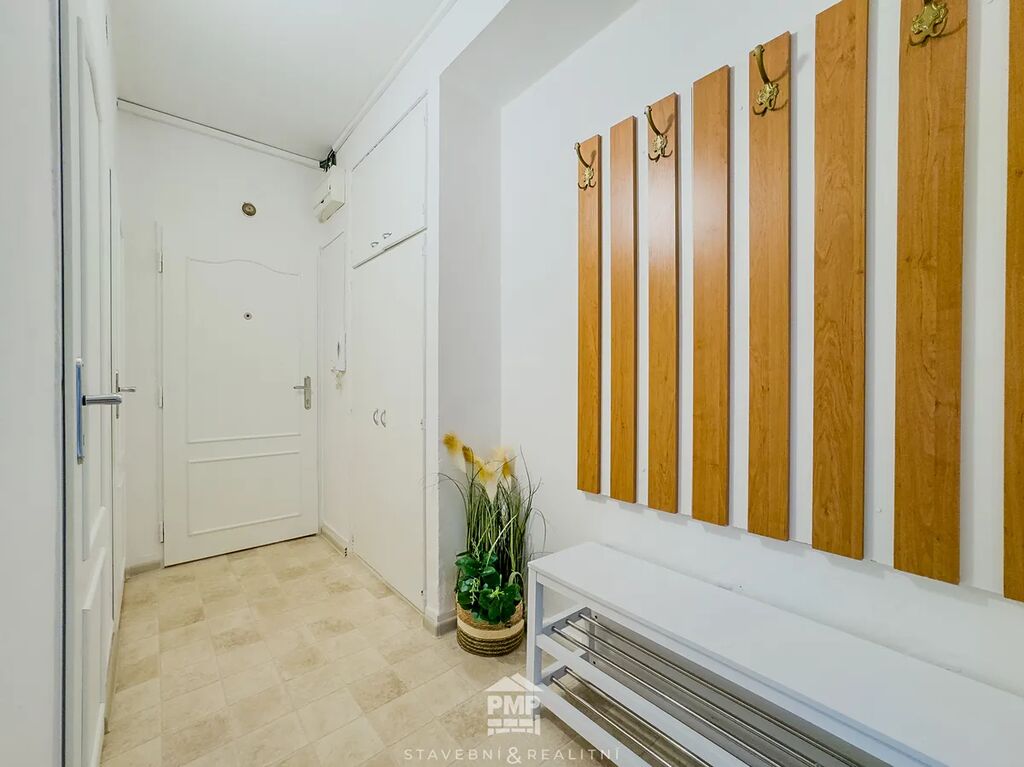 Celková užitná plocha bytu činí 62 m². Nabízí průchozí obývací pokoj přístupný z kuchyně a chodby a ložnici se vchodem na prostornou zasklenou lodžii. Koupelna je vybavena sprchovým koutem, umyvadlem, bojlerem na ohřev teplé vody a místem pro pračku. Mezi vybavení kuchyně patří lednice, plynový sporák v kombinaci s elektrickou troubou a vestavěná skříň, v níž je umístěn plynový kotel zajišťující vytápění bytu. K využívání jsou k dispozici dvě sklepní kóje (2,20 m² a 2,80 m²), které poskytují dostatek úložného prostoru. Byt je k dispozici ihned. Energetický štítek budovy: třída C.