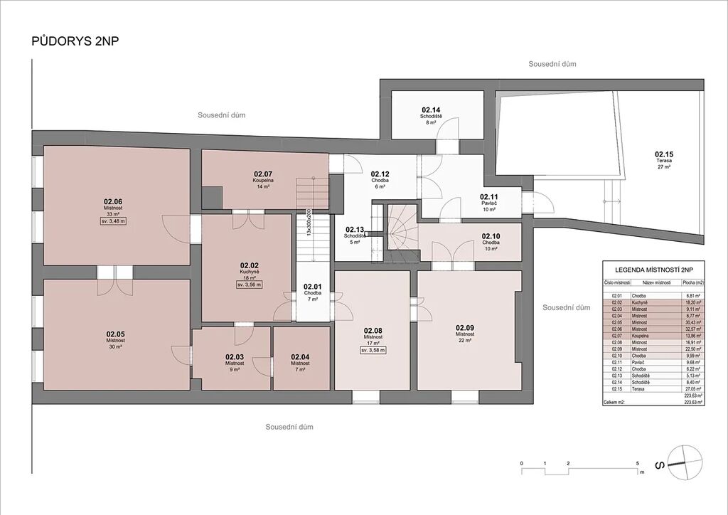 2. NP: Byt 1+1 (72 m²) s terasou/pavlačí o velikosti 30 m², která poskytuje příjemný venkovní prostor k posezení.