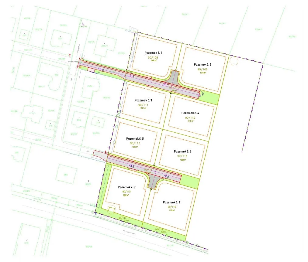 Pozemek je kompletně zasíťovaný - obecní vodovod, obecní kanalizace a elektro přípojka (přípojky jsou vytažené přímo na pozemky ). Mezi pozemky je nová asfaltová komunikace s veřejným osvětlením. Komunikace se budou převádět do vlastnictví obce.