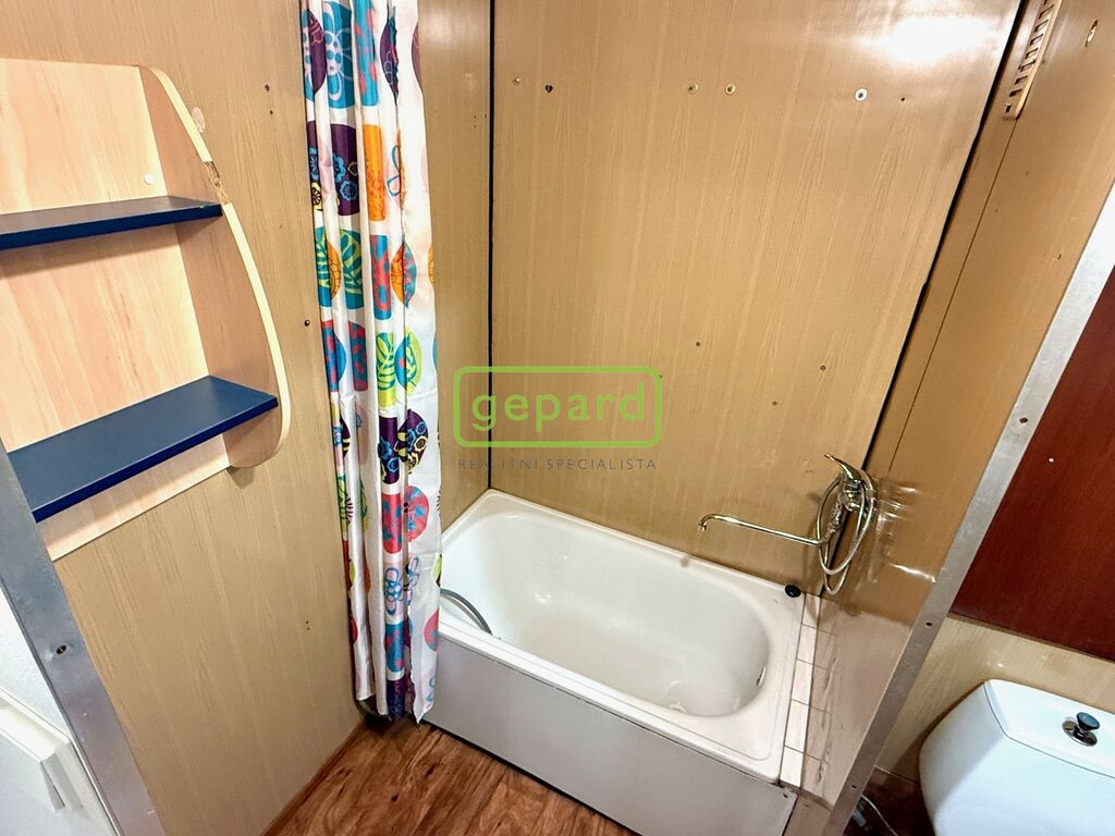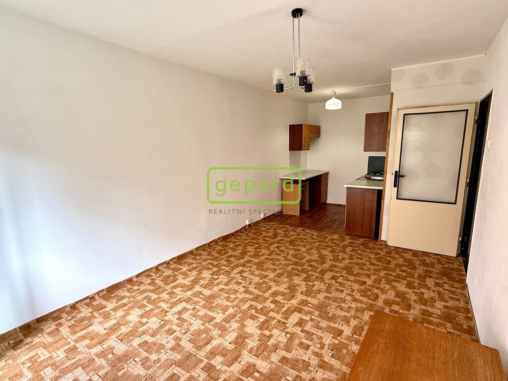 Obývací pokoj je propojený s kuchyňským koutem a vstupem na velký balkon táhnoucí se přes oba pokoje. Ložnice nabídne klidné zázemí. Koupelna s WC je v původním umakartovém provedení – funkční, ale ideální pro ty, kdo si chtějí byt postupně doladit podle svého vkusu.