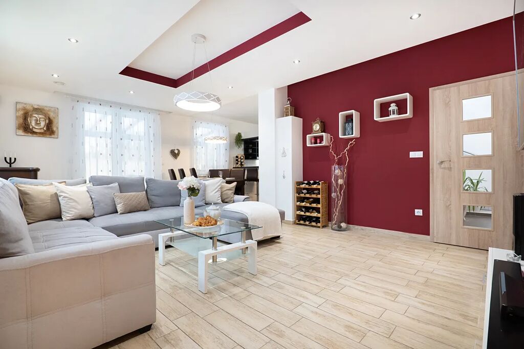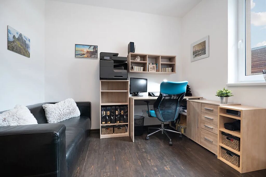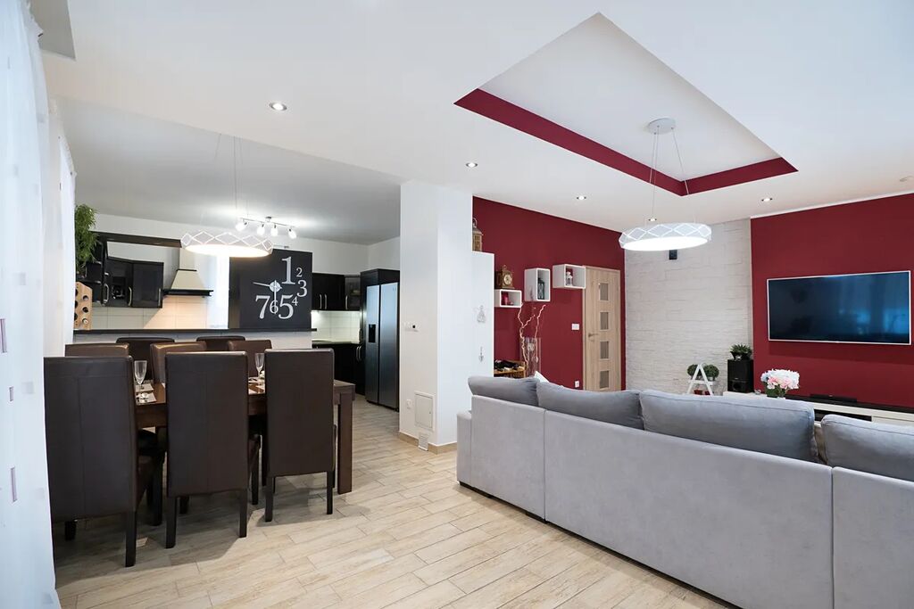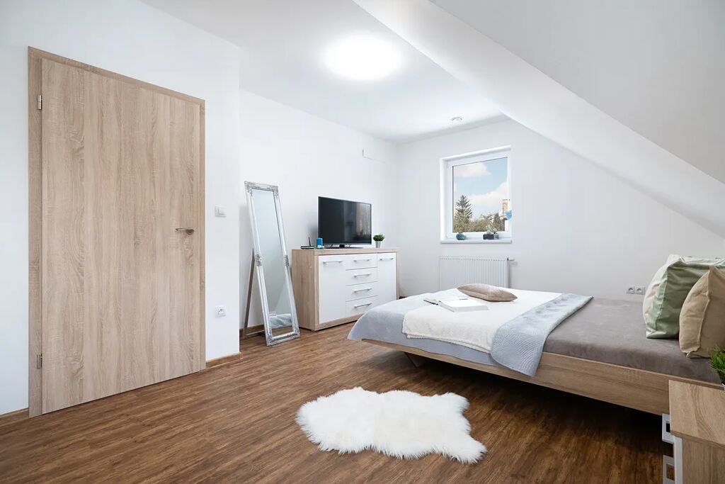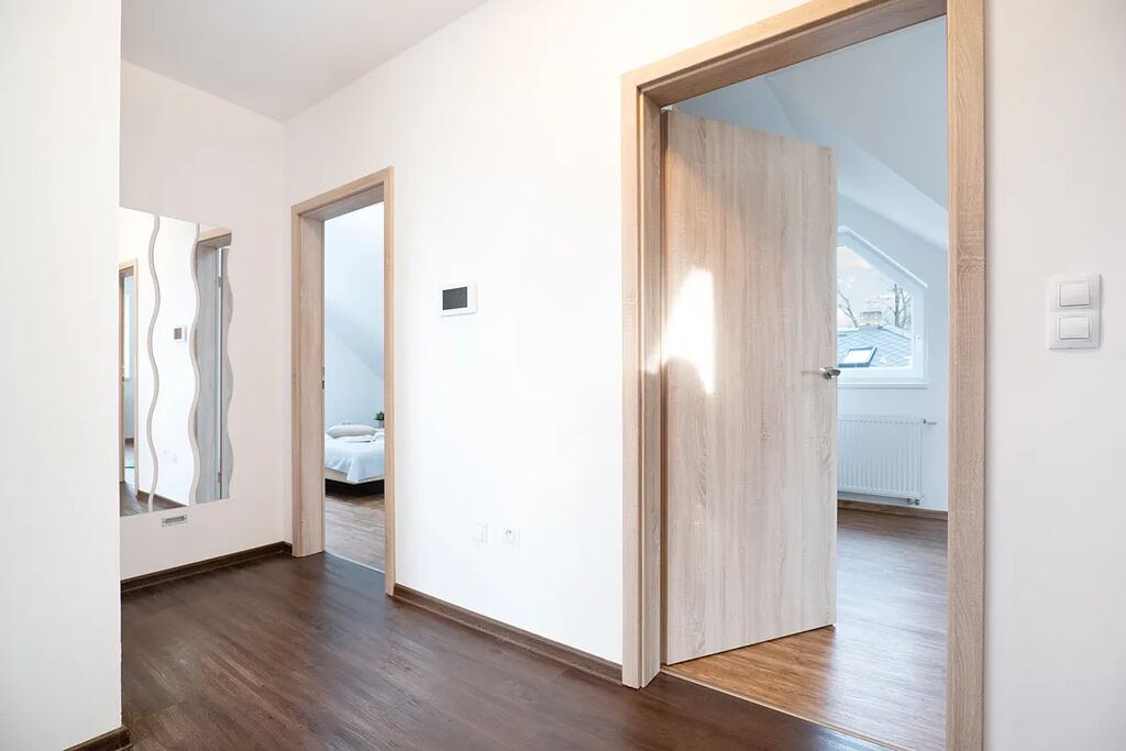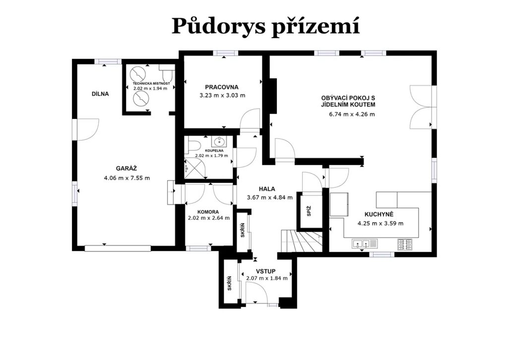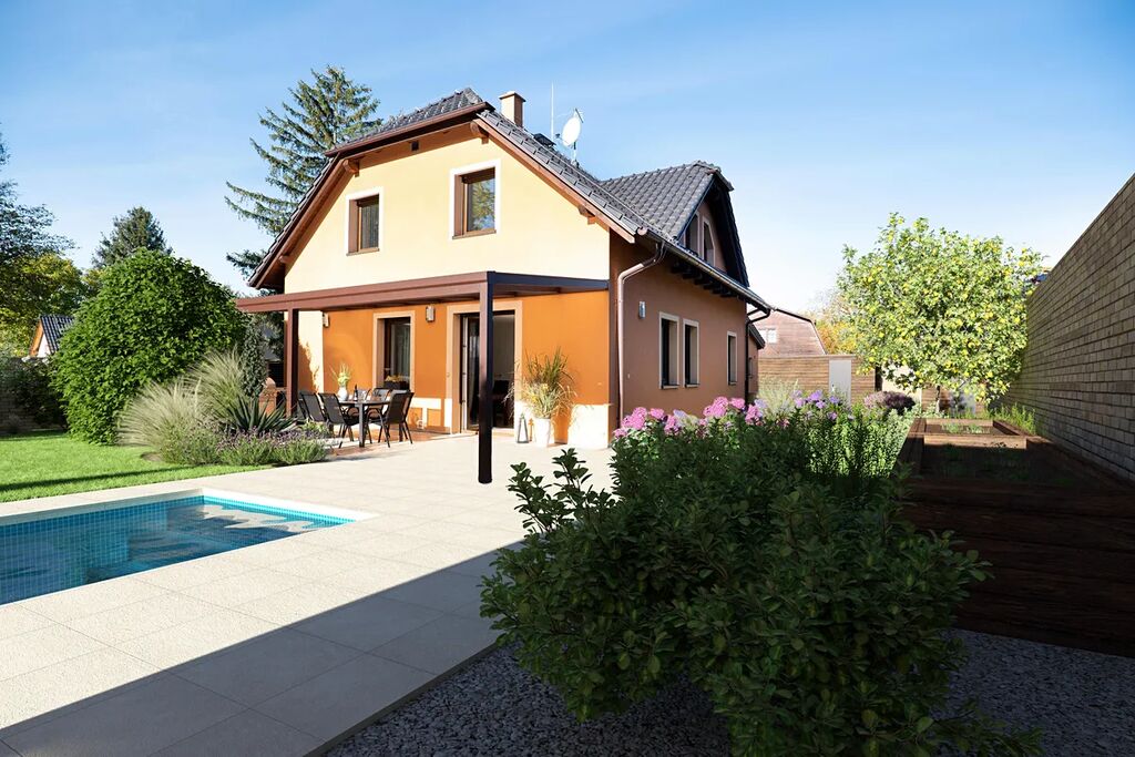 Interiér domu je navržen tak, aby splňoval všechny požadavky moderního bydlení. Dominantním prostorem je prostorný obývací pokoj s jídelnou, která je propojena s velkou kuchyní s barovým pultem. Tento otevřený prostor o velikosti více než 50 m² je ideální pro společné chvíle s rodinou i přáteli. Z obývacího pokoje je přímý vstup na zastřešenou terasu (28 m²), která nabízí skvělé místo pro relaxaci a venkovní posezení po celý rok. Příprava pro krb v obývacím pokoji je již hotová, což vám umožní snadno doplnit domov o útulnou atmosféru. V přízemí najdete také praktické zázemí, včetně vstupní haly s vestavnou šatní skříní, samostatné spíže, malé koupelny s toaletou a sprchovým koutem, pracovny a technické místnosti s přístupem do malého sklípku. Případně je zde možnost snadné úpravy dispozice na 6+kk, což nabízí flexibilitu pro větší rodinu nebo specifické potřeby.