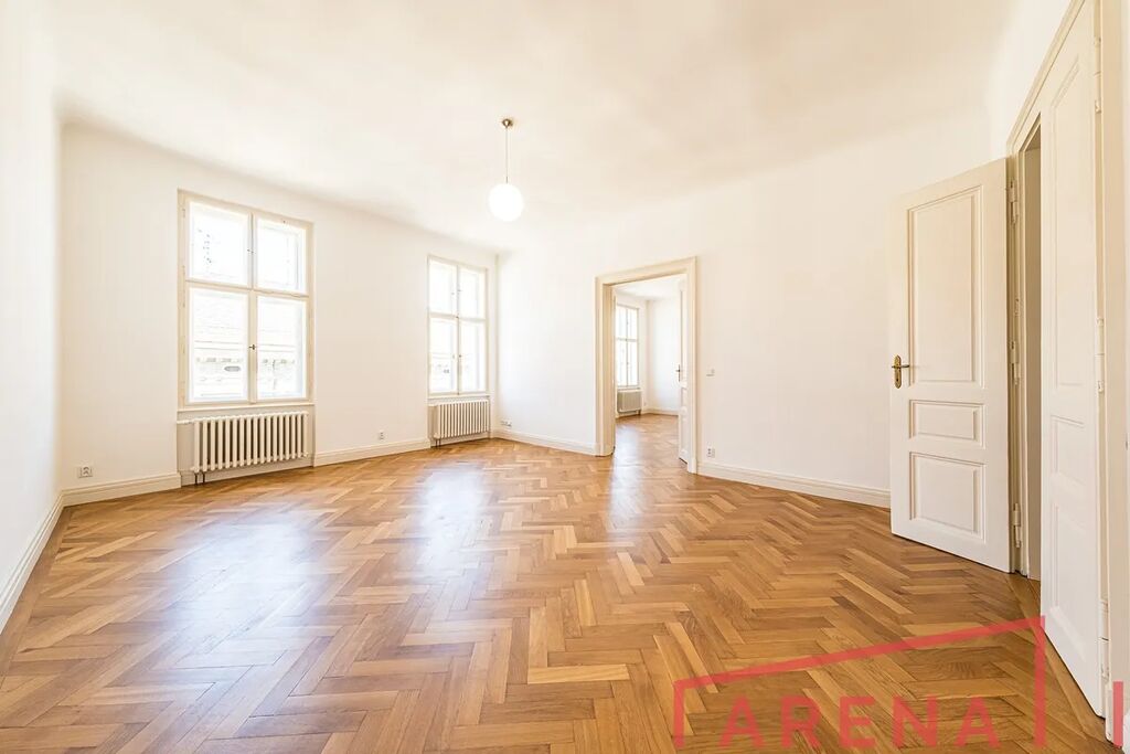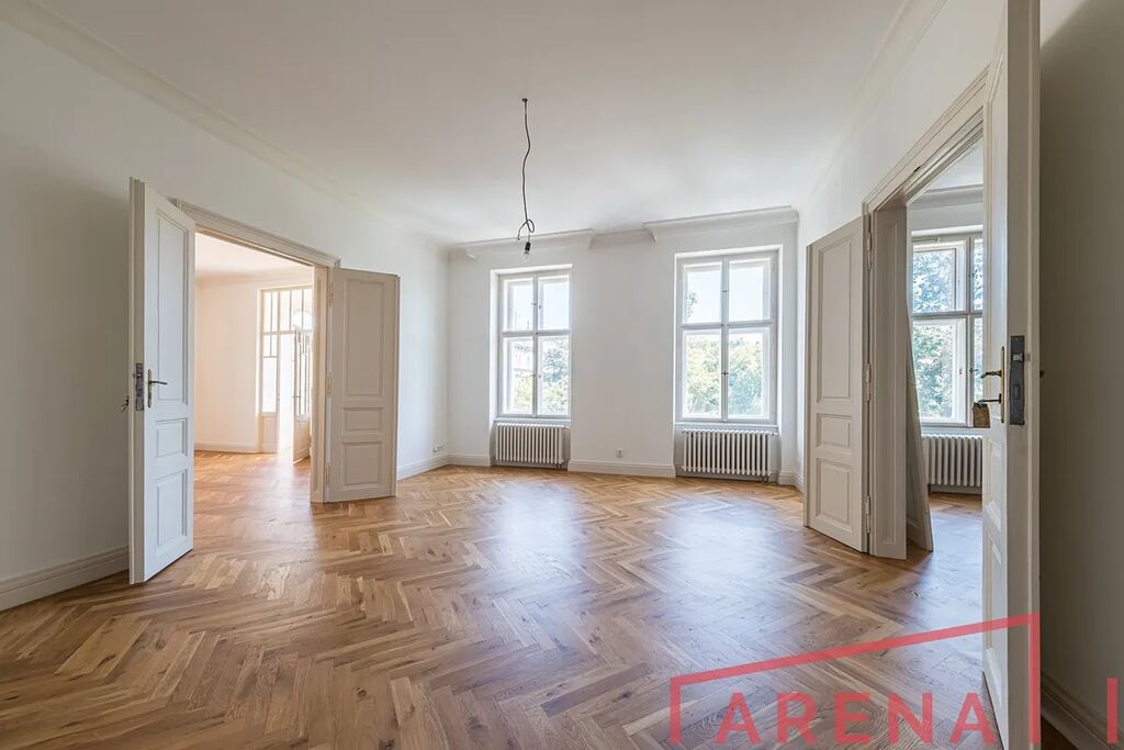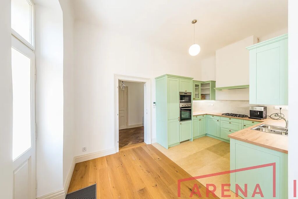 Byt zaujme elegantním interiérem s původními architektonickými detaily, vysokými stropy a kvalitními materiály.