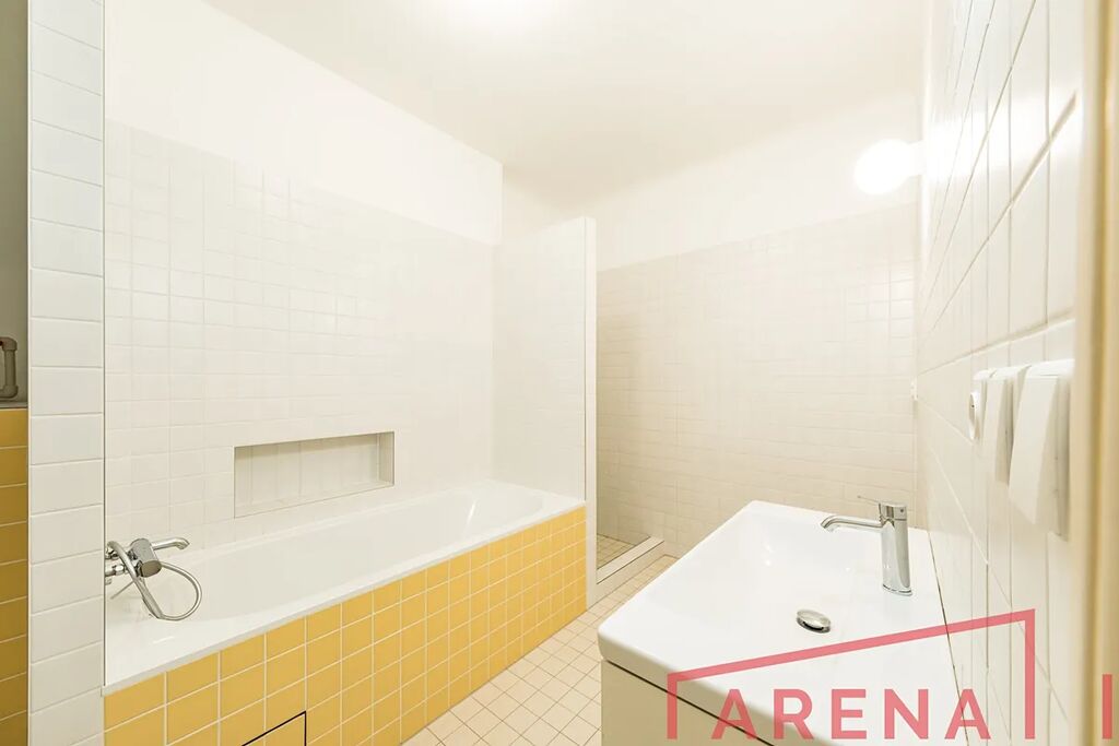- moderní koupelna s vanou, sprchovým koutem a přípravou pro pračku