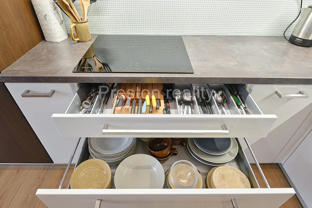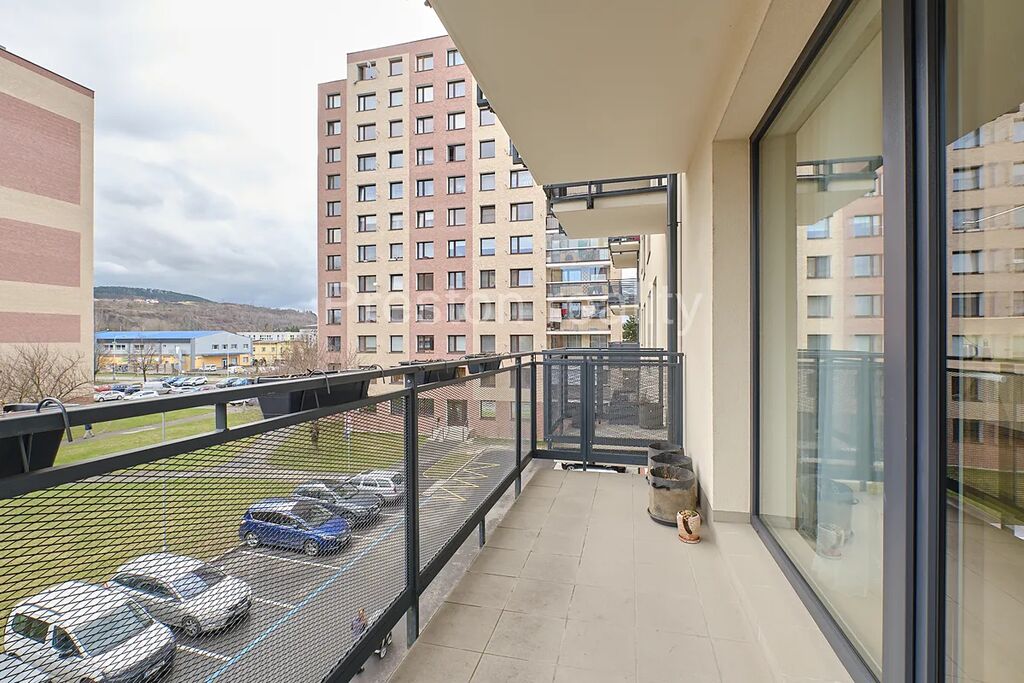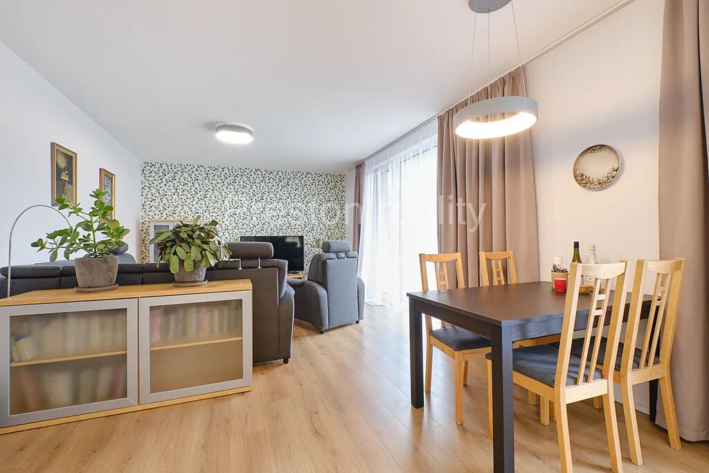 Celý byt je plně vybaven nábytkem a zařízením tak, jak je zobrazeno ve fotodokumentaci. Obývací pokoj má přístup na dva kryté balkóny, větší o ploše 7 m2, okolní zástavba je s příjemnými odstupy. Moderní kuchyňská linka je vybavena indukční varnou deskou, elektrickou troubou, mikrovlnou troubou, lednicí s mrazákem myčkou a digestoří. K dispozici je také kávovar, varná konvice a kompletní vybavení kuchyně nádobím. Obývacímu pokoji dominuje sedací souprava a televize již není součástí vybavení.