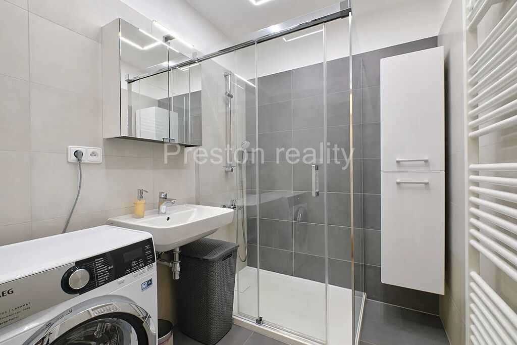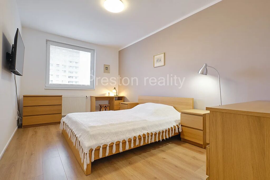 Větší ložnice je vybavena komodami a manželskou postelí, menší ložnice pak menší postelí a skříní. V bytě se nachází rovněž šatna s vestavnou, velkokapacitní skříní (šířka 216 cm, výška 257 cm). V prostorné koupelně je umístěn velký sprchovací kout (117 x 77 cm), pračka (AEG, 6kg s předním plněním) a skříňka na ručníky. WC je zvlášť. Vchod do bytu je chráněn bezpečnostními dveřmi. Podlahy bytu jsou pokryty kvalitní plovoucí podlahou v dřevěném dekoru. V ceně nájmu je vysokorychlostní internet (download 250 Mb/s – s možností navýšení rychlosti až na 1.000 Mb/s).