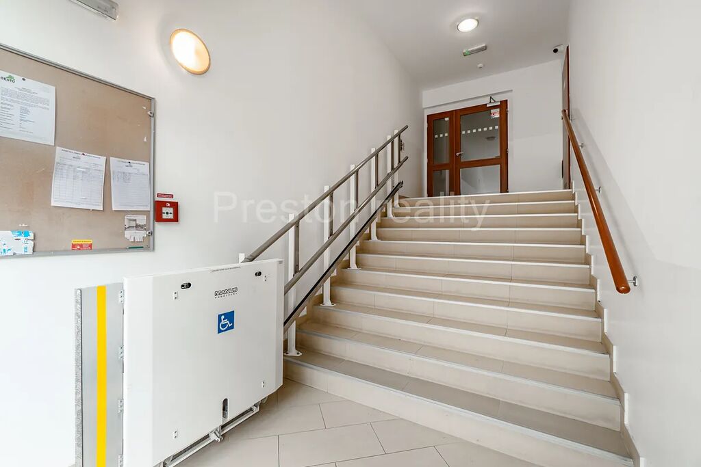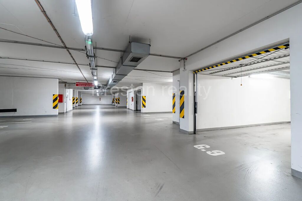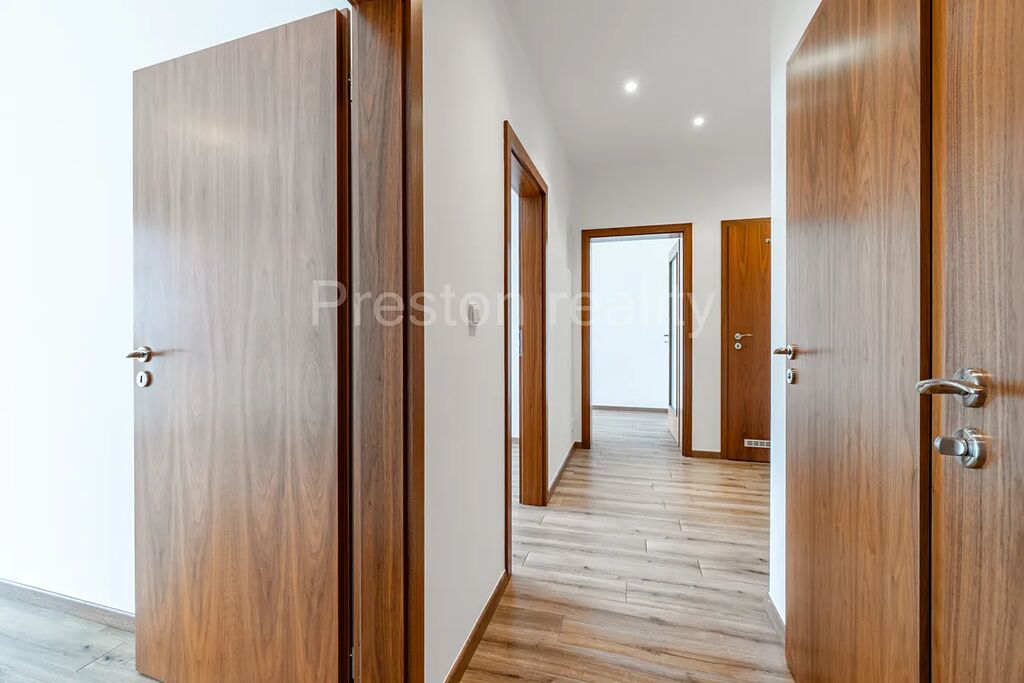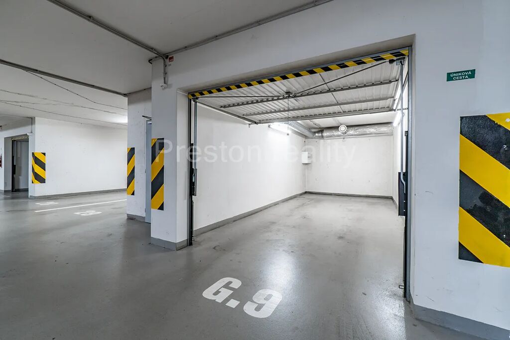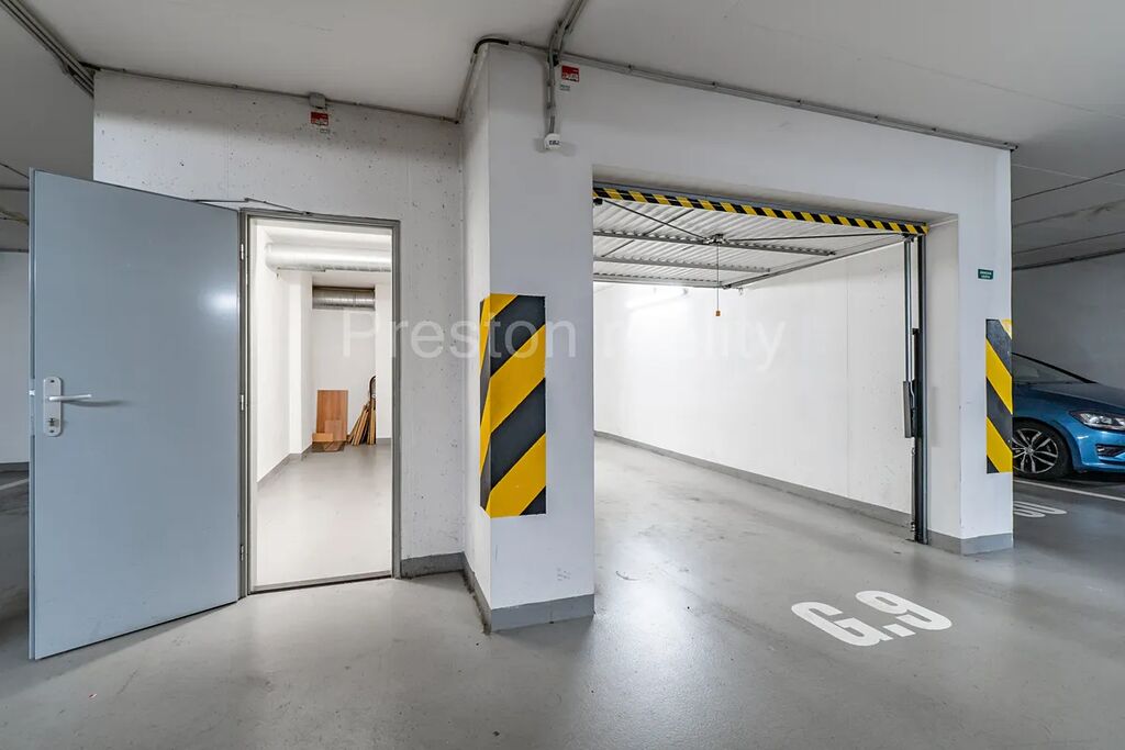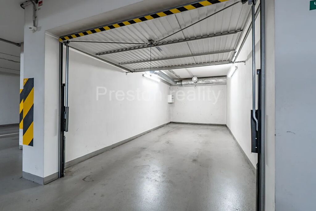 Bytu dominuje hlavní obývací pokoj s kuchyňským koutem (30 m2). Moderní kuchyňská linka je plně vybavena (elektrická trouba, mikrovlnná trouba, sklokeramická varná deska, lednice mrazák). Z obývacího pokoje je vstup na větší balkón (3,5 m2). V další části bytu se nachází dva samostatné pokoje (11 a 12 m2), přičemž jeden z nich má vlastní menší balkón (2 m2). V prostorné koupelně (5 m2) s rohovou vanou je prostor pro umístění standardně velké pračky (šíře 60 cm). WC zvlášť. K dispozici je také praktická komora v bytě (2,3 m2) a velký sklep u garážového stání ve třetím podzemním podlaží. Garáž o ploše 19 m2 má rozměry 2,87 x 6,67 m, přičemž vjezd je vrata umožňují vjezd pro vozidla o maximální šířce 2,24 m a výšce 1,94 m. Velkokapacitní sklep má plochu 10 m2 a rozměry 5,6 x 1,7 m. Pár kroků od vstupních dveří od domu je k dispozici praktická kočárkárna.