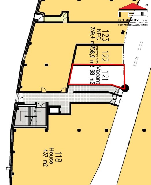 Prostor se nachází v přízemí obchodního centra, přímo vedle restaurace KFC, což zajišťuje vysokou viditelnost i přirozený pohyb zákazníků.