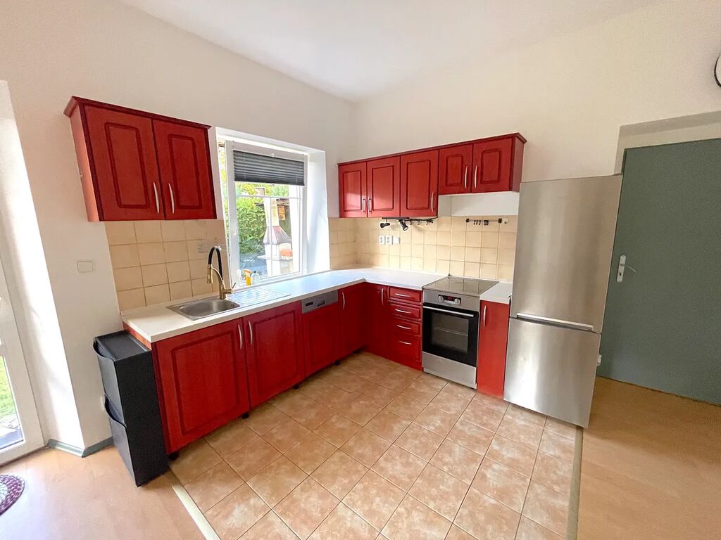 Byt 2+kk o velikosti 46,51 m2 se zahrádkou 134 m2 se nachází v přízemí panelového domu v ulici Rakouská. Vytápění bytu je vlastním kombinovaným plynovým kotlem, který slouží i na ohřev teplé vody. Kuchyňská linka je vybavena myčkou, varnou deskou, troubou, lednicí.