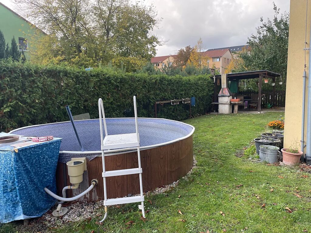 Zahrádka je vybavena zahradním domečkem (uskladnění kola, nářadí apod.), pergolou a bazénem. Údržba zahrádky je v kompetenci nájemníků.