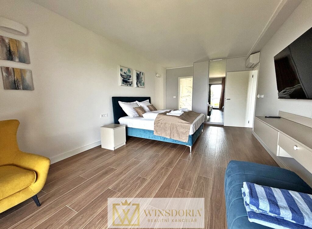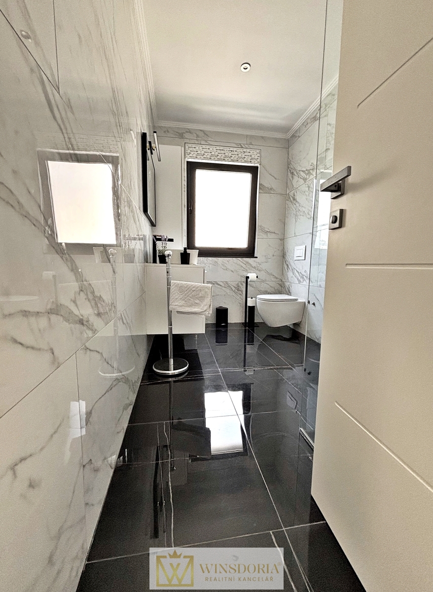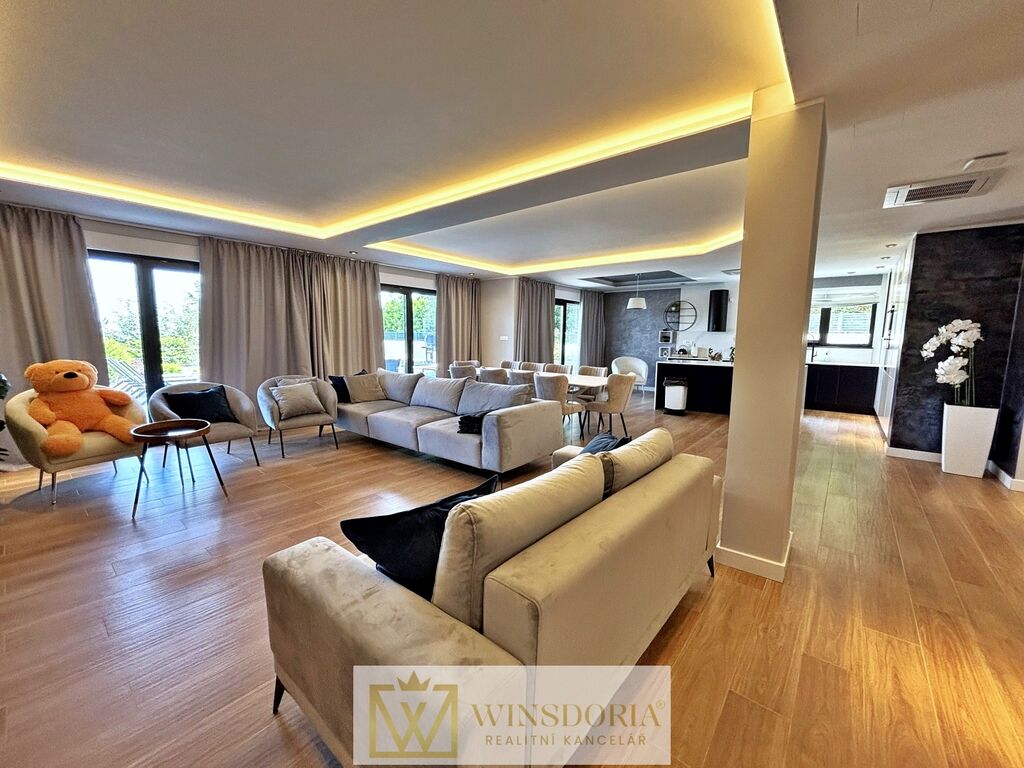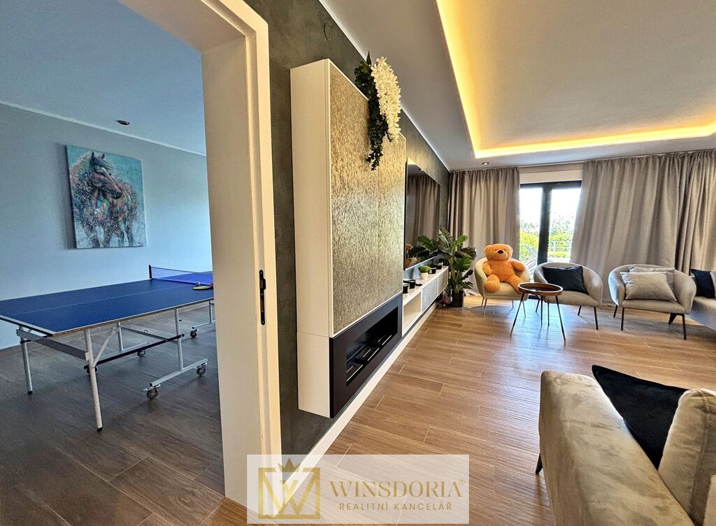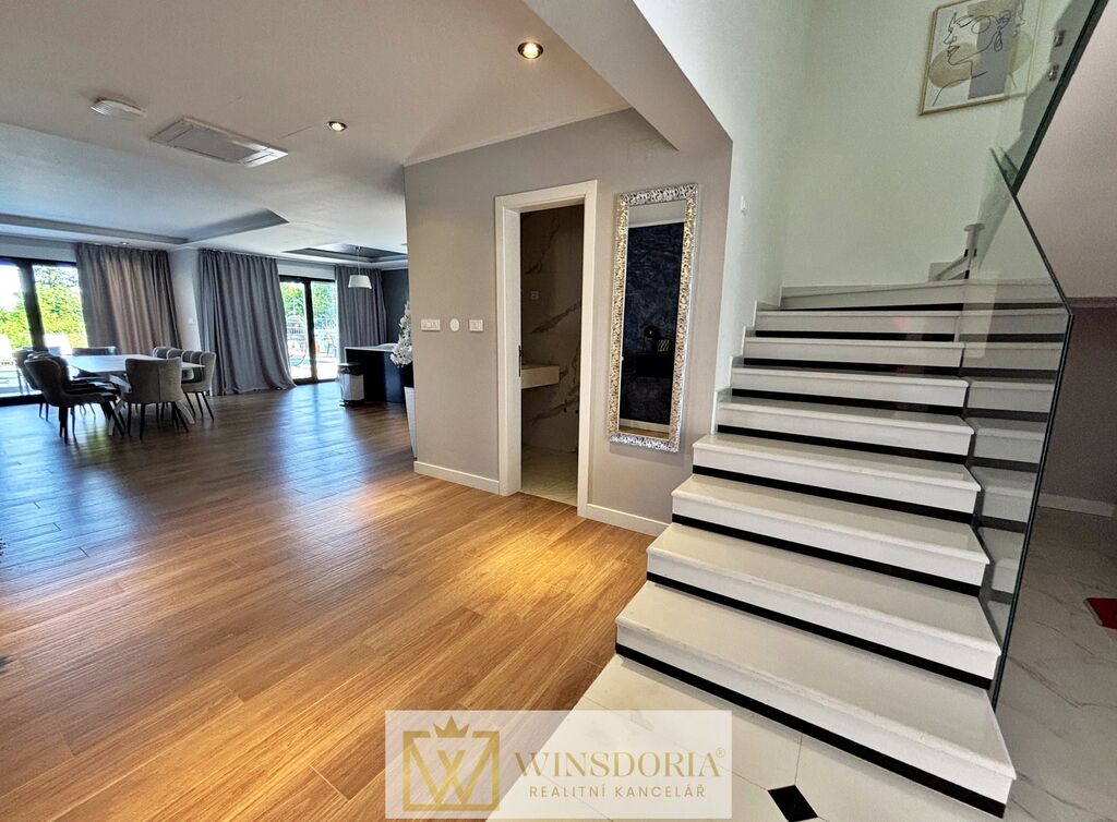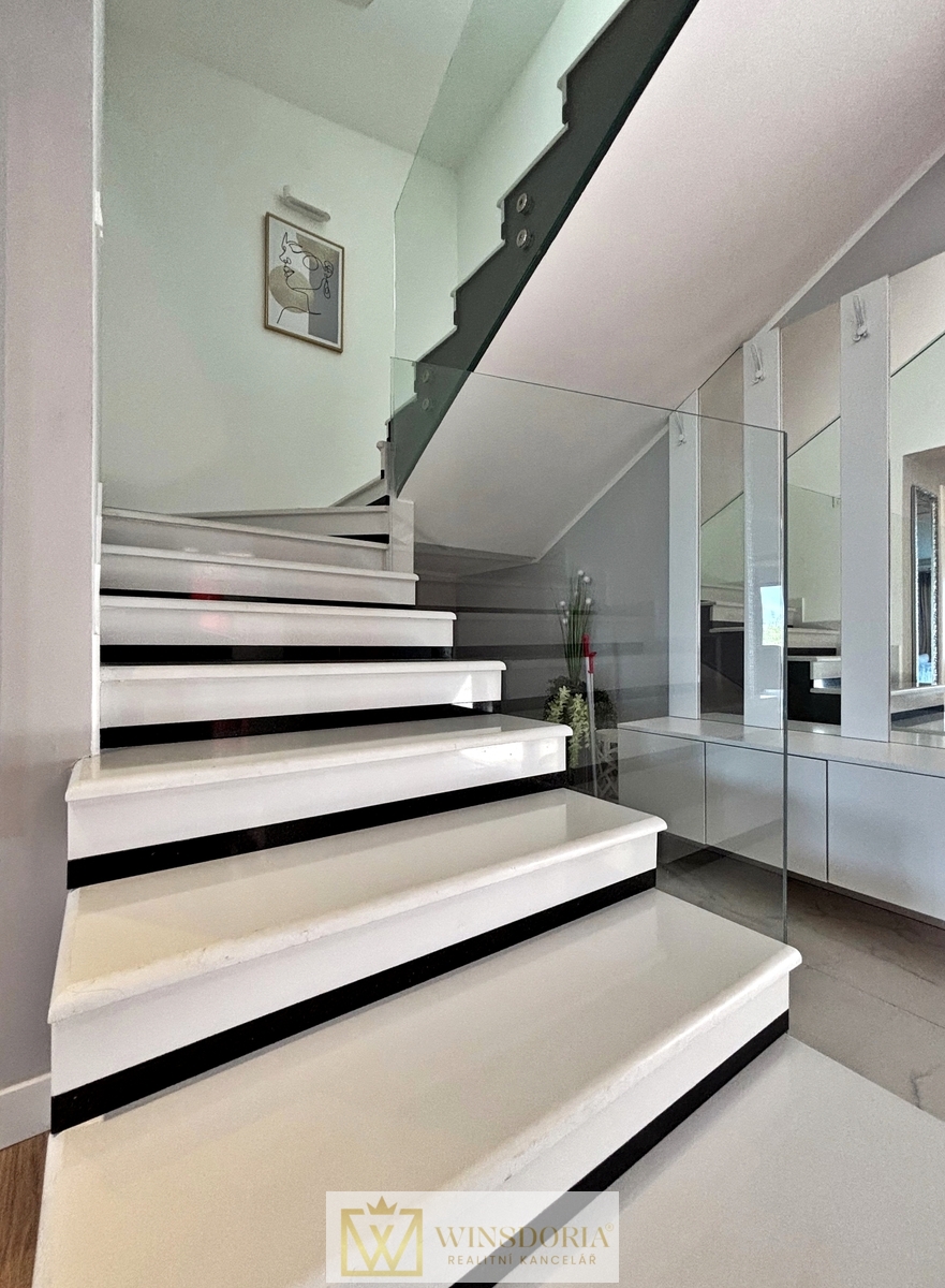 Dům je vybaven hliníkovým truhlářstvím s elektrickým ovládáním žaluzií, tepelnou fasádou, klimatizací ve všech pokojích a elektrickým podlahovým vytápěním v koupelnách. Prodává se kompletně zařízený.