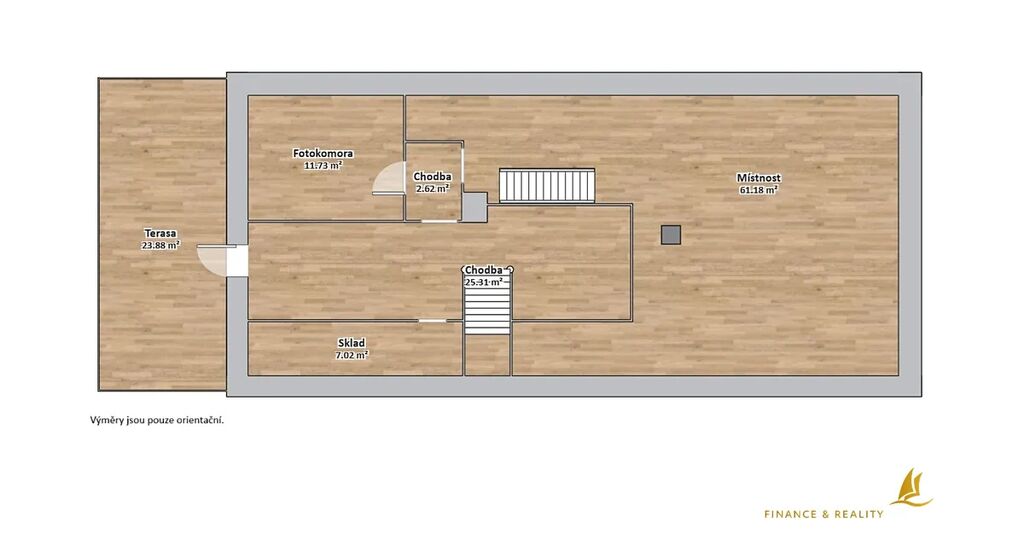 Podkroví je přístupné po pohodlném dřevěném schodišti a nabízí rozsáhlé prostory, fotokomoru, úložné místnosti a vstup na terasu s výhledem do horní zahrady.