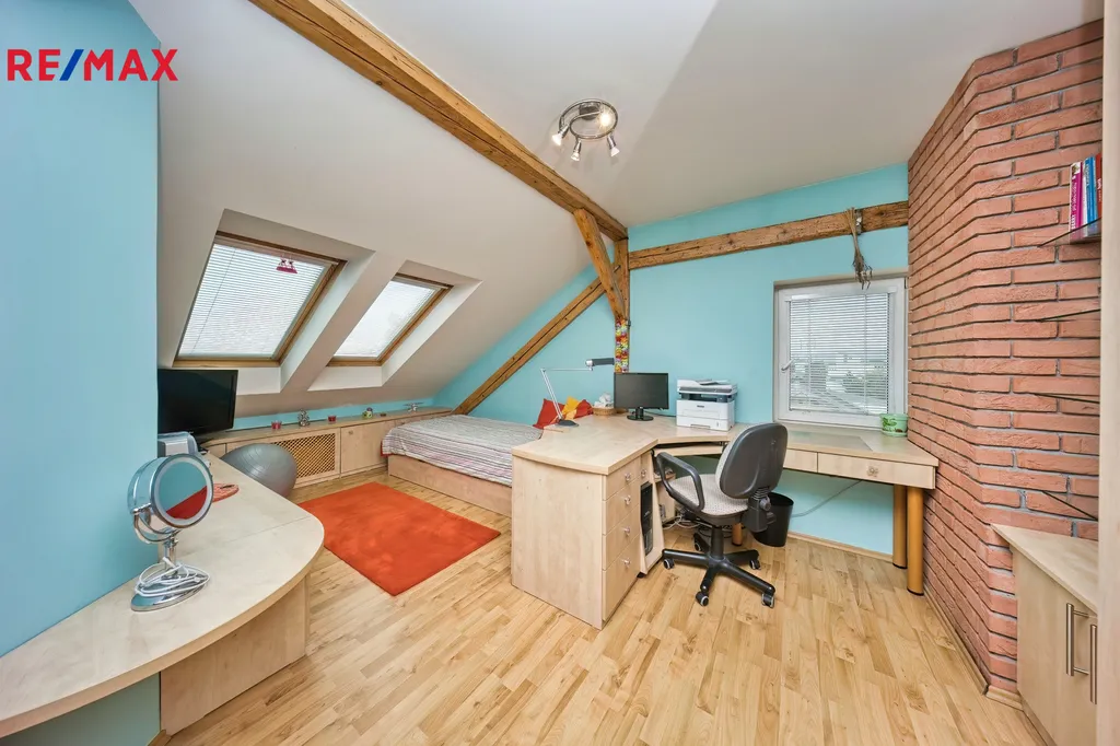 Ve 2. NP se nachází prostorný obývací pokoj s krbem (30,75 m²) plynule navazující na jídelnu (25,19 m²) a kuchyň (13,32 m²). Dále zde najdete předsíň/halu (6 m²), komoru (4,59 m²), koupelnu s vanou (3,97 m²) a samostatné WC (2 m²). Do 3. NP (podkroví) vede točité schodiště umístěné v jídelně, nebo lze využít i vstup z chodby v 3. NP bytového domu. V podkroví se nachází tři samostatné pokoje (27,55 m², 20,7 m², 16,52 m²), koupelna se sprchou a WC (5 m²), komora (2,26 m²), šatna (1,82 m²) a předsíň s výstupem na terasu (7,55 m²) v hrubém provedení.
