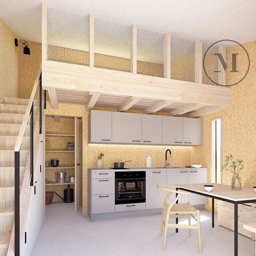 Interiér nabízí: prostor pro kuchyňku, stolek a sezení, sprchu, WC a umyvadlo, úložné prostory a chladicí zónu (např. lednice/mrazák pro ovoce a zeleninu), schody na půdu, kde je prostor třeba na sušení bylin či ovoce nebo také prostor pro relaxaci nebo rodinné hry. Součástí standardního vybavení je také koupelna se sprchovým koutem, závěsným WC, umyvadlem a elektrickým ohřívačem vody.