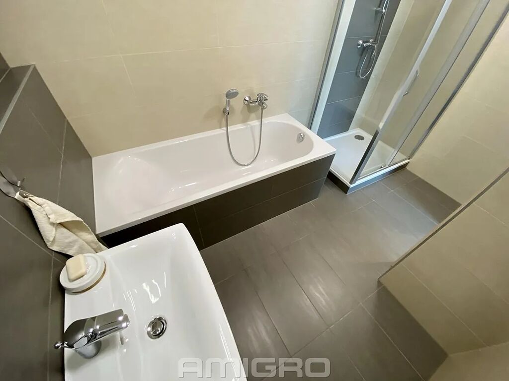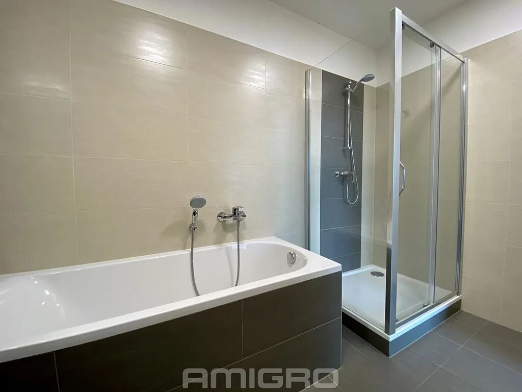 V koupelně je vana i sprchový kout. Dostatek úložných prostor - v bytě jsou 2 šatny a na patře je komora o výměře 4,5 m2.