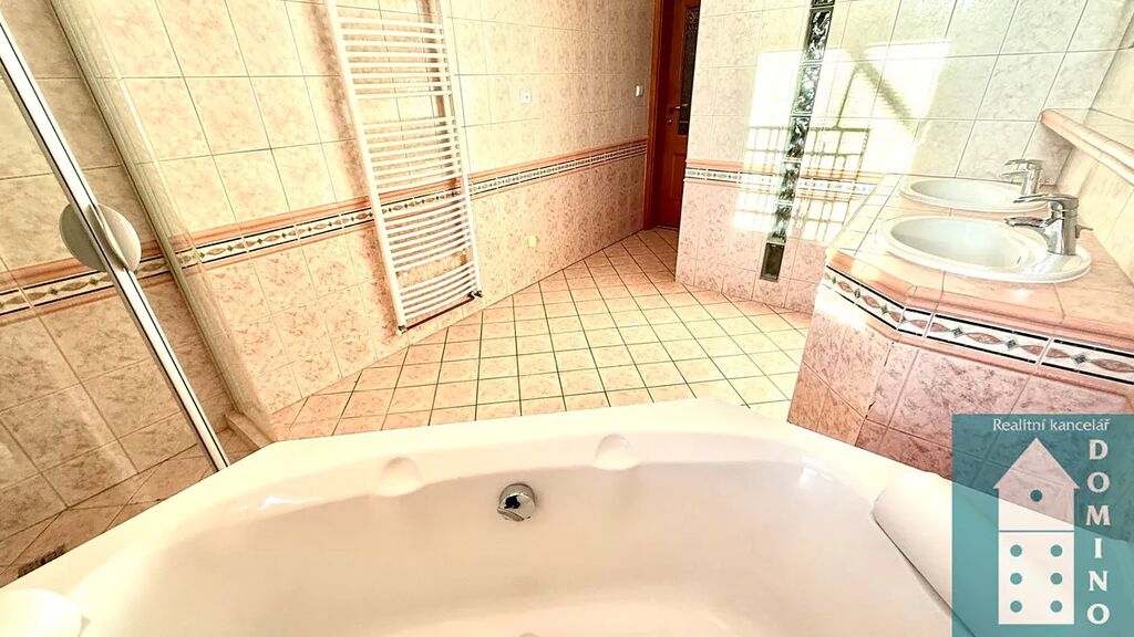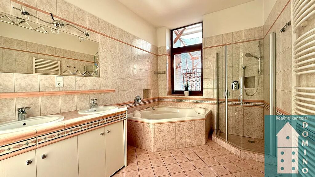 - prostorná koupelna s rohovou vanou, sprchovým koutem a dvěma umyvadly