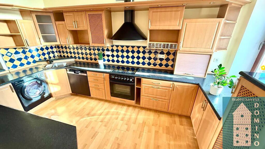 - kuchyně – zde se nachází velká kuchyňská linka s vestavěnými spotřebiči a myčkou, kde se vám bude příjemně vařit
