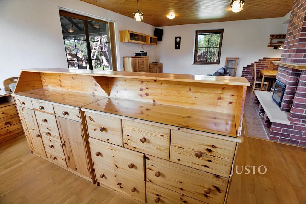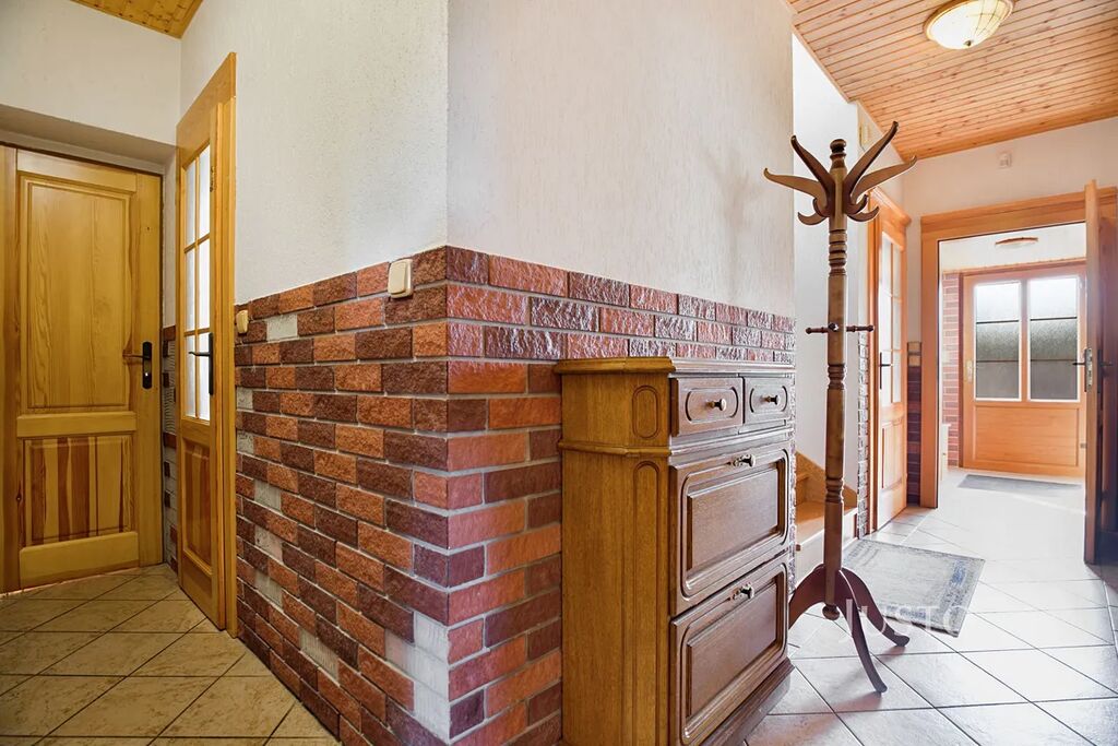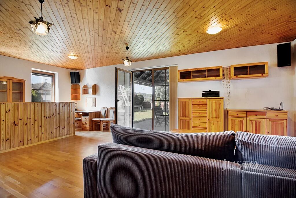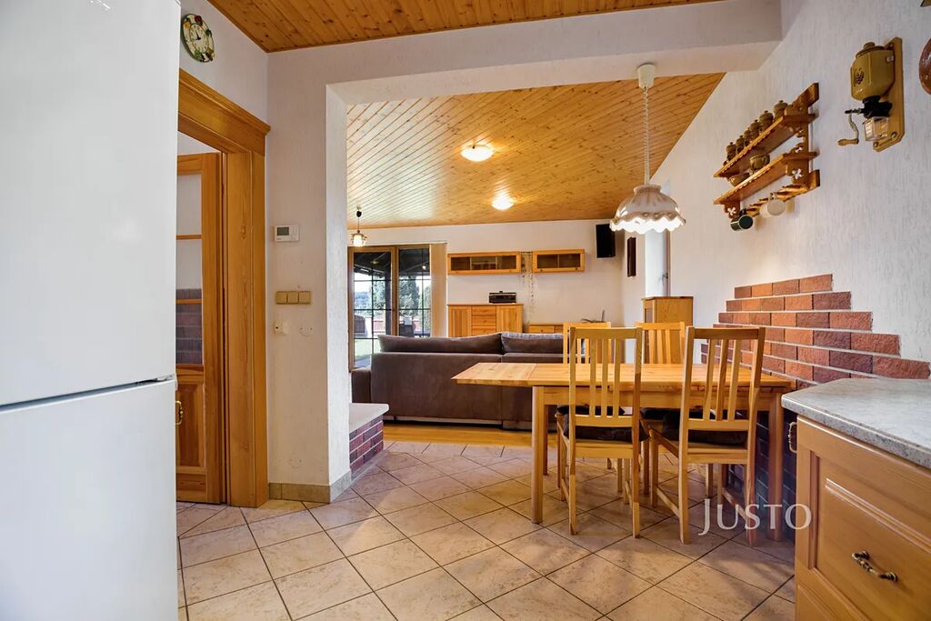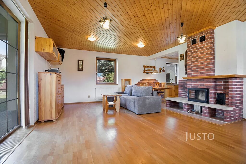 •	Přízemí: zádveří, velký obývací pokoj s krbem a přímým vstupem na terasu a zahradu, kuchyně s jídelnou, koupelna s WC.