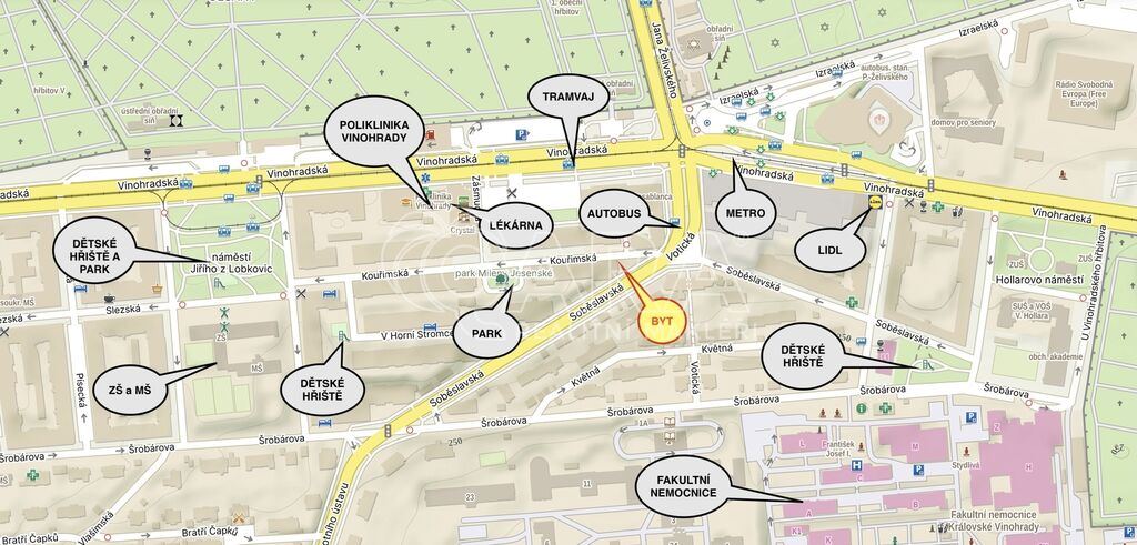 ✅ V okolí najdete supermarket Lidl, restaurace, kavárny, fitness centrum, lékárnu, nemocnici i OC Flora (jen 12 minut pěšky).