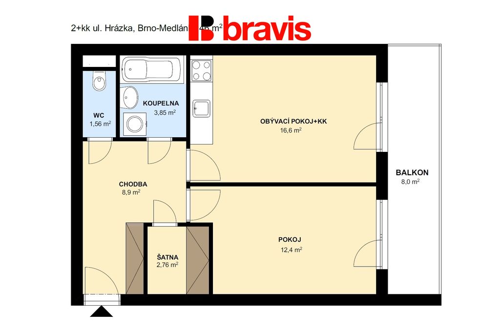 Byt se nachází v klidné a velmi dobře vybavené lokalitě Brno – Medlánky, v těsné blízkosti Technologického parku a firem jako IBM, což ocení zejména zaměstnanci těchto společností. Výborná občanská vybavenost je samozřejmostí – v pěší dostupnosti najdete zastávku autobusu (200 m), potraviny, restaurace, mateřskou školku, dětská hřiště, plavecký bazén i posilovnu. Okolí nabízí spoustu možností pro sportovní i volnočasové aktivity a zároveň klidné bydlení s dobrou dostupností do centra města.