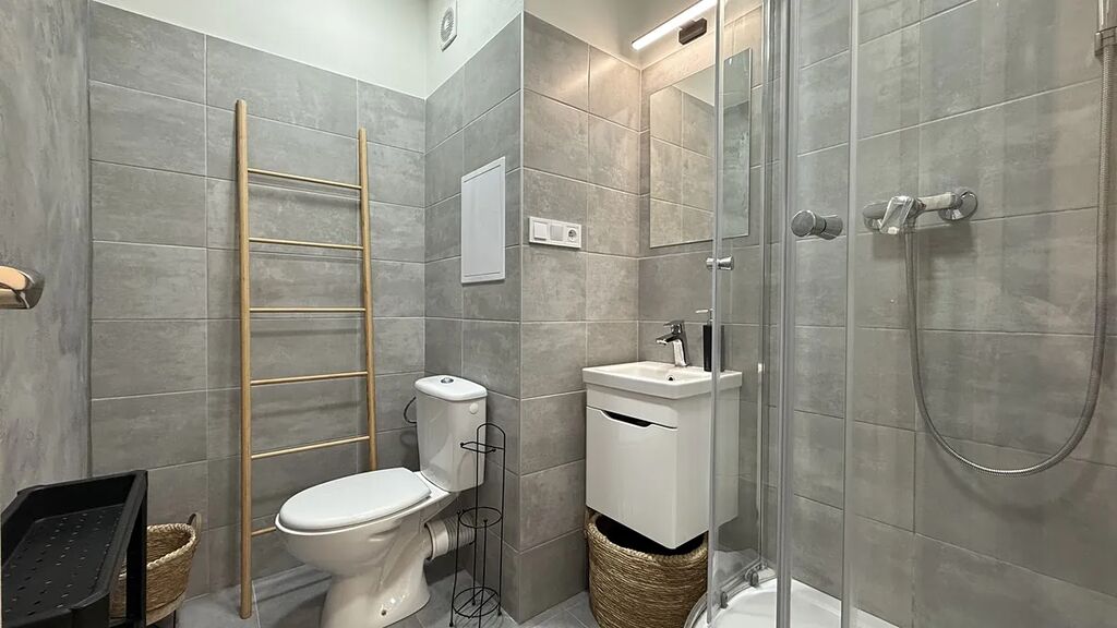 Byt je orientován na jih, je zařízen pro trvalé bydlení, s moderní koupelnou, sprchovým koutem i automatickou pračkou, v kuchyni spojené s jídelním koutem, hezkou sestavou skříněk a pracovního prostoru, lednicí, sklokeramickou dvojplotýnkou, digestoří, horkovzdušnou troubou, toustovačem a rychlovarnou konvicí, jídelním stolem s židlemi a knihovnou. Na chodbě pak i s věšákem na kabáty, v prosklené lodžii s komfortní pohovkou a stolkem. Vše je citlivě zařízeno do útulného celku.