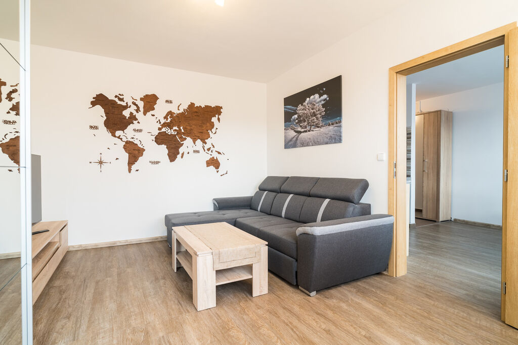 V pokoji je velká skříń a menší sedací souprava - rozkládací. Veškeré zařízení je v ceně bytu.
