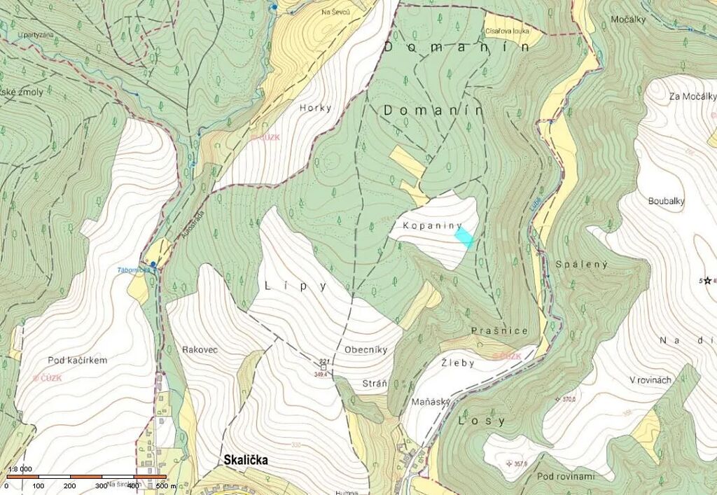 Nabízíme k prodeji pěkný udržovaný pozemek o velikosti 2 158 m2 v blízkosti rozvíjející se obce Skalička u Tišnova, okres Brno – venkov, vhodný jako investice. Jde o zemědělskou půdu na kraji lesa, která je tvořena 2 parcely zapsaných na LV 573. Parcela č. 806 o velikosti 1 958 m2 (obvod cca 35 x 60 x 38 x 51 m) zapsaná v listu vlastnictví jako trvalý travnatý porost s dobrou bonitou půdy, na ní přímo navazuje parcela č. 413 o velikosti 200 m2 zapsaná jako lesní pozemek. Pozemek se nachází na mírném kopci s výhledem do krajiny, je téměř rovinatý a je dobře přístupný po obecních cestách. Aktuálně se na pozemku hospodaří. Pozemek lze využít ne jen zemědělsky, ale také například k relaxačním aktivitám, soukromému zemědělství nebo zahradničení, jako louku a nebo jako investici. Pozemek je vzdálený od města Tišnov 8 km a od města Brna 17 km.