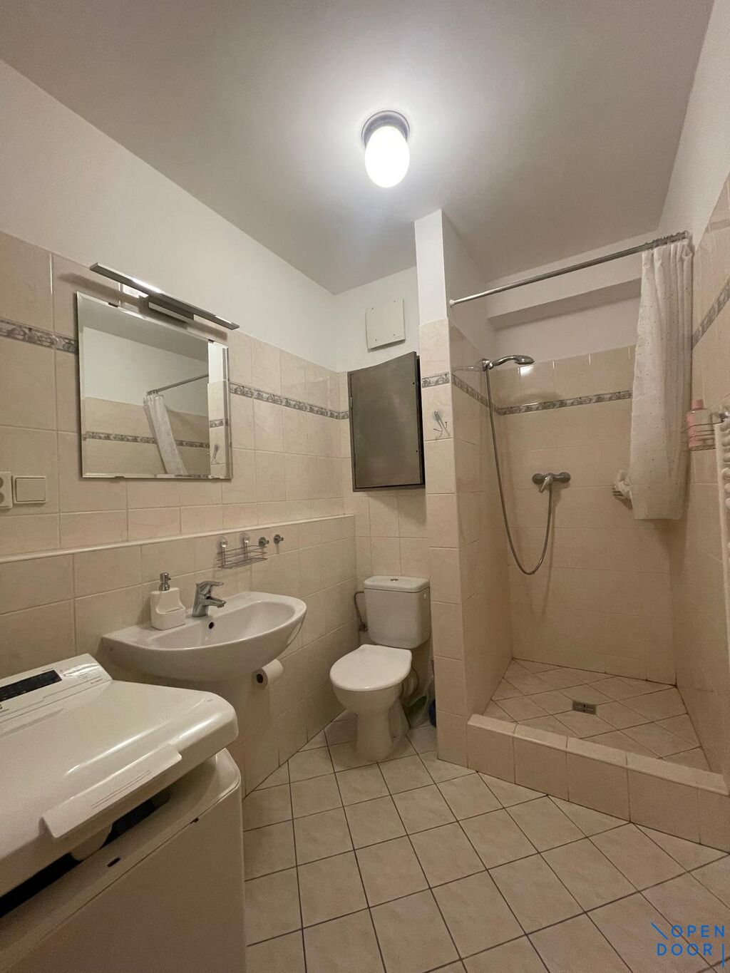 Byt se nabízí jako částečně vybavený, ve vstupní hale je prostorná vestavěná skříň a vchod do koupelny s toaletou, sprchovým koutem a pračkou. Hlavní místnost nabízí kuchyňský kout se spotřebiči (lednice s mrazákem, elektrický vařič, myčka nádobí, digestoř a mikrovlnná trouba), velkou skříň, policový systém a stůl. Na podlahách je plovoucí podlaha a dlažba.