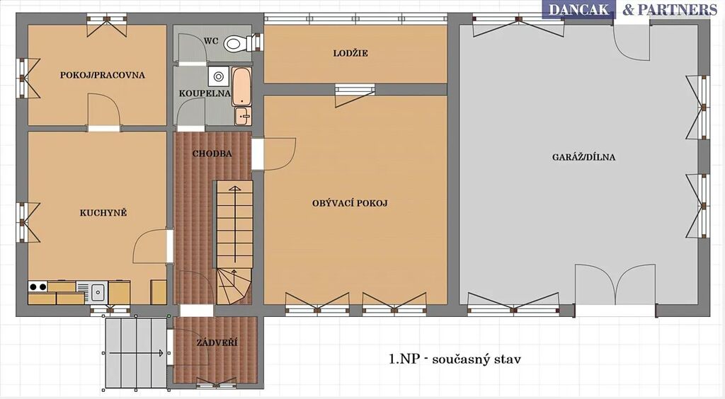 V přízemí domu se nachází vstupní část, kuchyně, menší pokoj, koupelna s WC a prostorný obývací pokoj se vstupem na zasklenou lodžii.