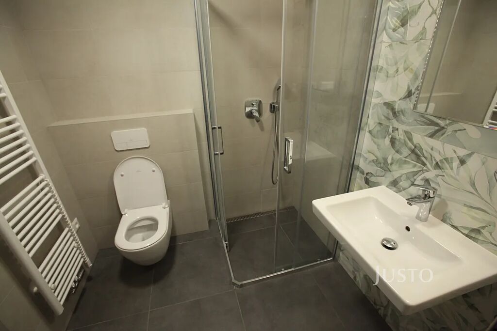 Co se týká vybavení, byt je vybaven kuchyňskou linkou s kvalitními vestavnými spotřebiči a ledničkou s mrazákem. Zbytek interiéru si vytvoříte podle svého vlastního vkusu a potřeb. Praktická posuvná stěna elegantně odděluje obývací část od ložnice, takže prostor působí útulně a zároveň si zachovává dostatek světla i volnosti.