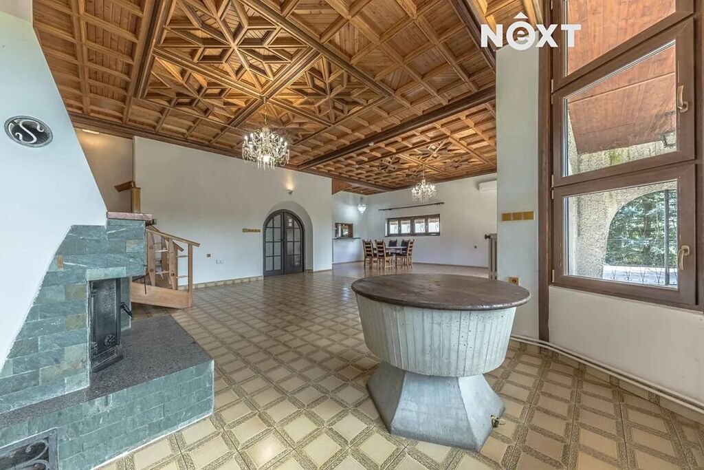 Ze vstupní chodby v přízemí je vlevo kuchyň s plně vybavenou linkou a okénkem pro podávání jídel do jídelního koutu. Vpravo je koupelna s vanou a WC a schodiště do suterénu domu. Naproti vstupu do domu se vstupuje do prostorného obývacího pokoje (67 m2) který je dominantou celého domu. Tato velkolepá místnost s dřevěným kazetovým stropem, francouzským oknem na terasu a výhledem do zahrady má krb s vložkou a výduchy, jídelní kout, klimatizační jednotku a dřevěné schodiště do mezaninu. Tam je další koupelna s vanou, samostatné WC a obytný pokoj. V patře nad mezaninem jsou vedle sebe tři prostorné neprůchozí ložnice. Z chodby mezi pokoji je vlevo vstup na balkon. Z posledního pokoje vpravo je vstup na půdu.