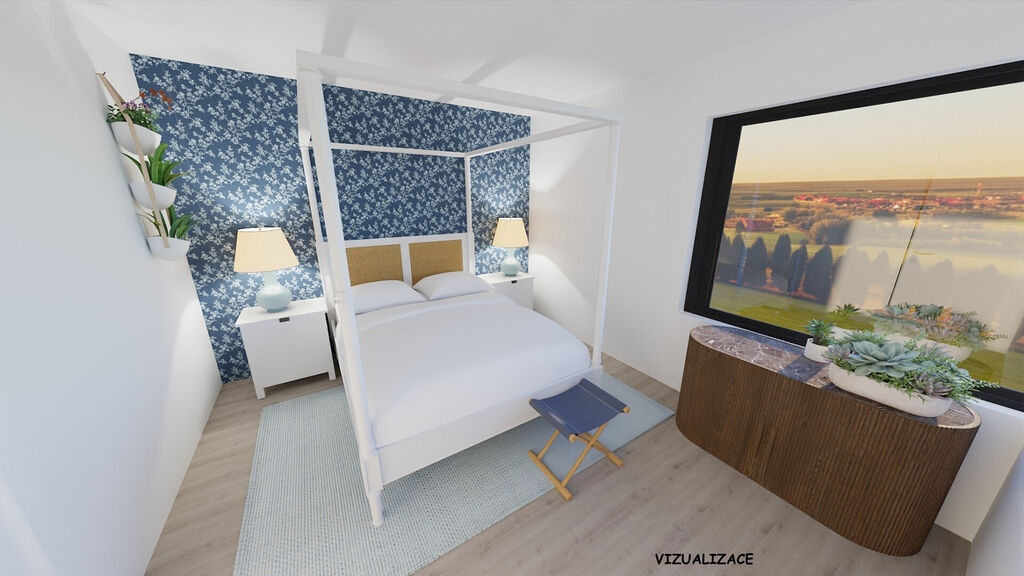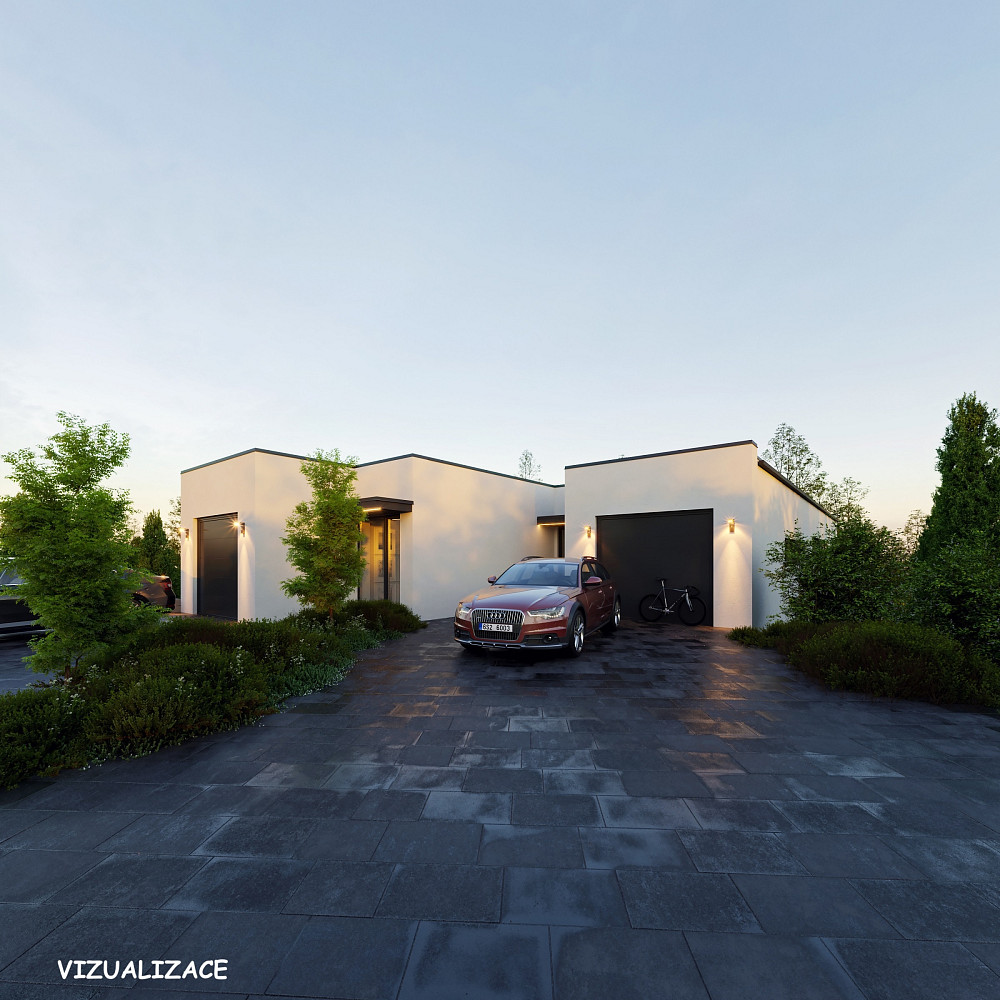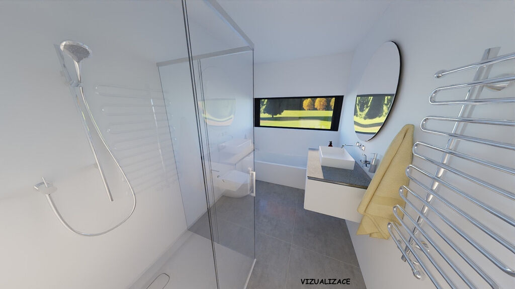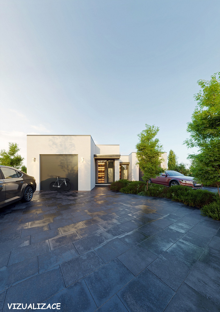 Komfort doplňují exteriérové elektrické žaluzie, řízené větrání s rekuperací Jablotron, dlažby nebo vinylové podlahy, v garáži epoxidová stěrka.