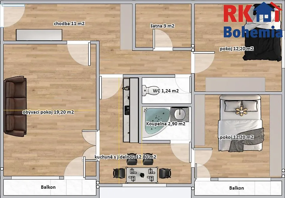 V bytě se nachází ložnice (12,20 m2), obývací pokoj (19,2 m2), pokoj (12,2 m2), kuchyň (12,8 m2), koupelna s vanou a umyvadlem (2,9 m2), samostatné WC s umyvadlem (1,24 m2), komora (3 m2) a prostorná předsíň (11 m2). Užitná plocha bytu je 74,54 m2 + sklepní kóje 1,24 m2 + 2 lodžie (2 x 2,56 m2).