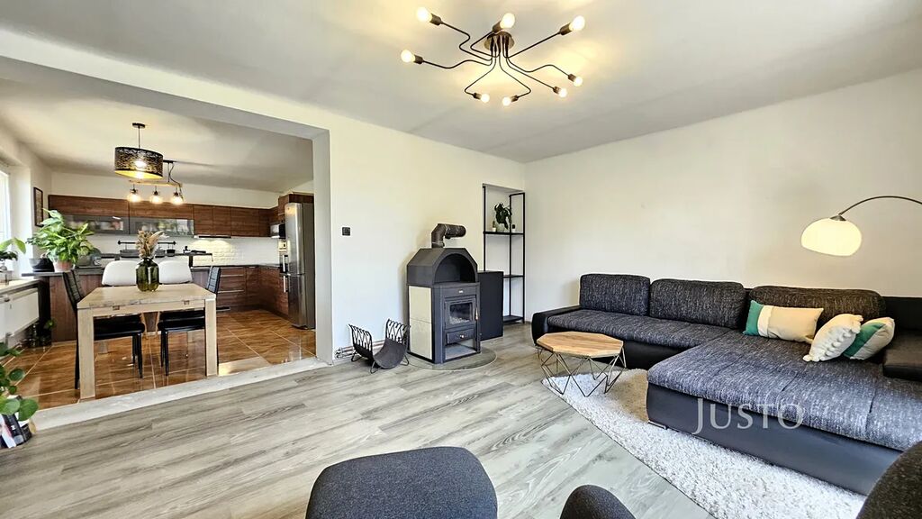 V přízemí domu je pak garáž, která je průchozí do sklepa. Zahrada je s pergolou a skladem zahradní techniky, který se nachází pod terasou přízemního bytu. Zahrada je oplocená, zatravněná, soukromí na ní zajišťuje vzrostlý živý plot. Byt je velmi pěkný, prostorný, světlý. Prošel rekonstrukcí koupelny, kuchyně, obytných místností, má nová plastová okna. Na dokončení čeká toaleta a vstupní chodba. Je vytápěn elektrokotlem nebo krbovými kamny, které jsou umístěny v obývacím pokoji. Současní majitelé využívají v zimních měsících převážně krbová kamna. Je zde možnost připojení na plynovou přípojku.