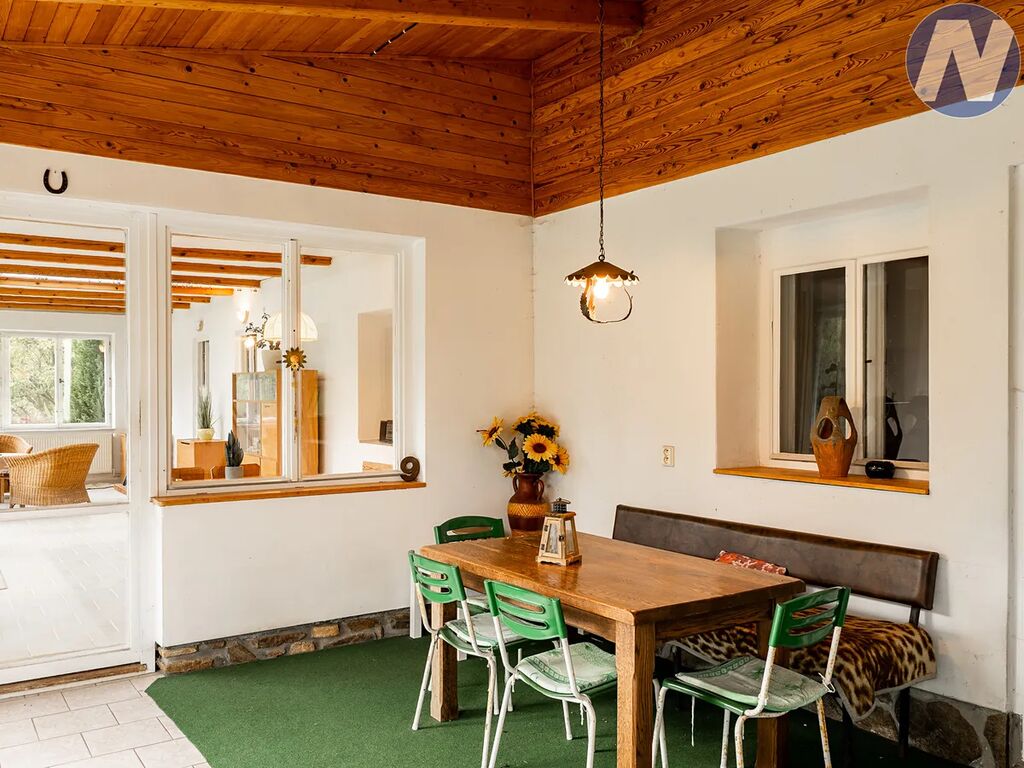 Dům v přízemí nabízí obývací část se zimní zahradou a krbem, kuchyni, koupelnu s vanou a samostatné WC. V patře se nachází čtyři podkrovní pokoje, druhá koupelna se sprchou a WC – dostatek prostoru pro rodinu i přátele.