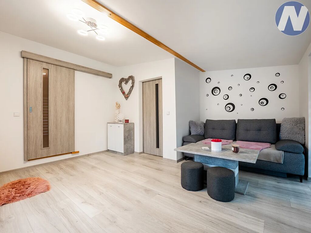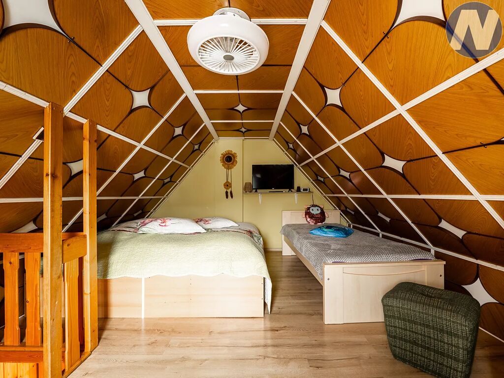 Interiér chaty je útulný a prakticky řešený – v přízemí se nachází obývací pokoj, kuchyně, společenský prostor s krbem a koupelna, v podkroví pak ložnice s dostatkem místa pro přespání. K dispozici je i sklepní prostor.