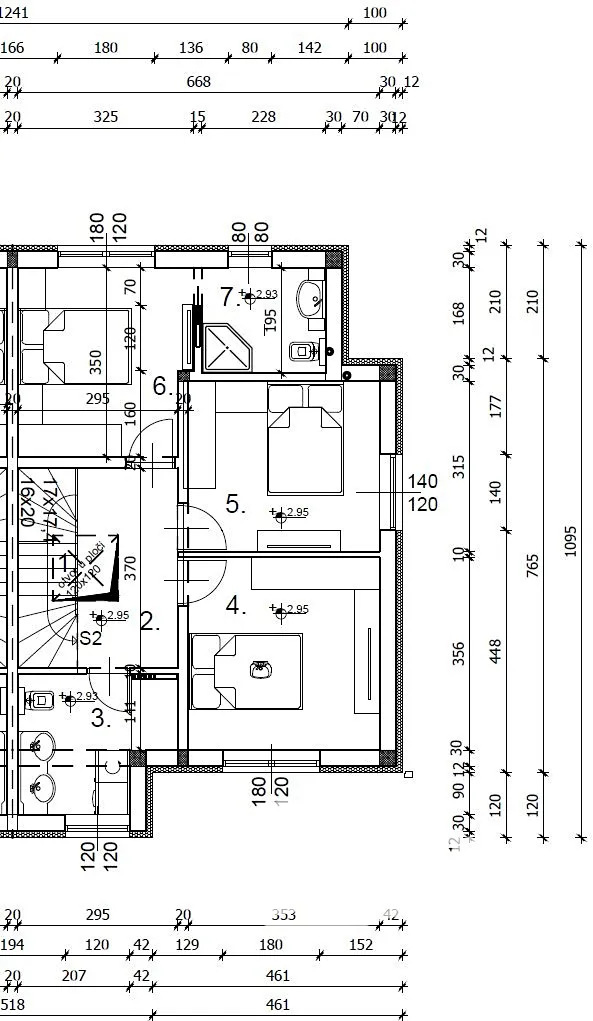 Dům se skládá ze dvou podlaží. Přízemí tvoří krytý vstup, chodba, WC, kuchyně s jídelnou a obývacím pokojem, schodiště do patra a krytá terasa. Plocha přízemí je 55,57 m2. V prvním patře se nachází chodba, koupelna a tři pokoje, z nichž jedna má vlastní koupelnu. Plocha prvního patra je 57,39 m2.