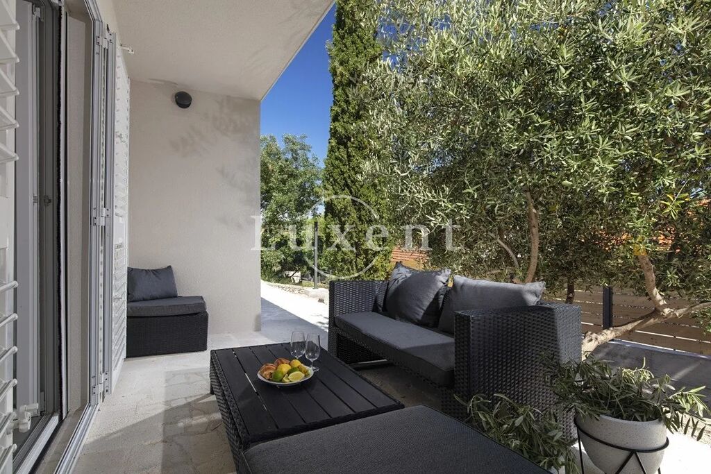 Nabízíme na prodej moderní rodinný dům v malebném městečku Rogoznica v srdci chorvatské Dalmácie, situovaný v mimořádně atraktivní lokalitě pouhých 150 metrů od moře a centra města. Nemovitost se nachází na pozemku o rozloze 530 m², který zahrnuje obytnou budovu a parkovací plochu. Dům se rozkládá na třech podlažích a nabízí tři samostatné, plně vybavené apartmány. V přízemí se nachází jednopokojový apartmán se soukromou zahradou a krytou terasou, v prvním patře dvoupokojový apartmán s prostornou terasou a výhledem na moře a v nejvyšším patře luxusní penthouse se dvěma ložnicemi, dvěma koupelnami, velkou terasou s panoramatickým výhledem na moře a vlastní posilovnou.
